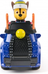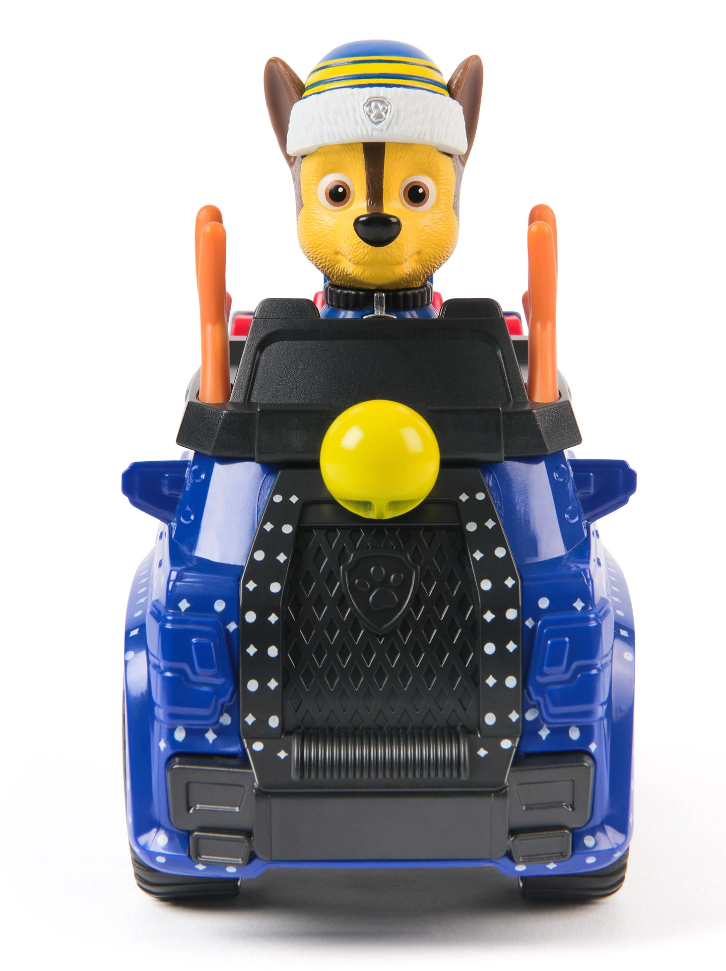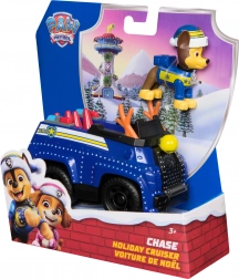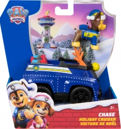 Detailní modrý vůz s vánočními prvky a pohyblivými koly. Figurka CHASE v zimní čepici sedí přímo v kokpitu a je připravena k akci.