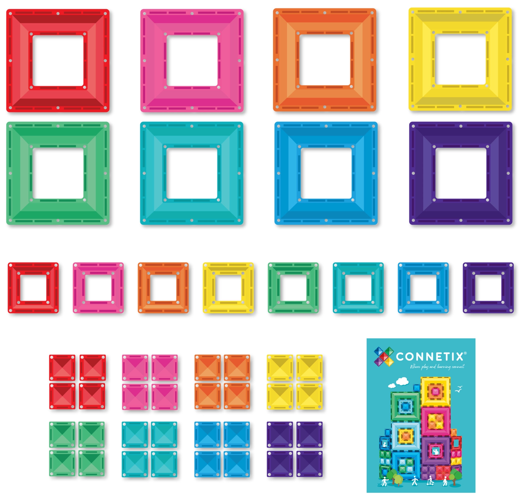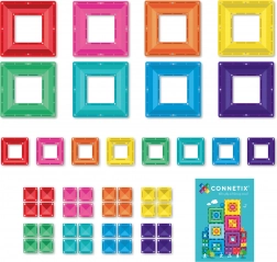 Set obsahuje portálové rámečky pro výrazné architektonické prvky i praktické malé čtverce pro detailní stavby. Skvěle se hodí pro domácí hraní, školky, Montessori aktivity i smyslovou terapii. Dílky jsou kompatibilní s dalšími sadami CONNETIX, takže můžete svou kolekci postupně rozšiřovat.
