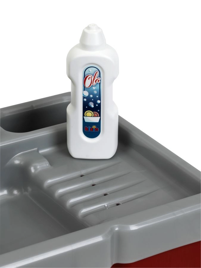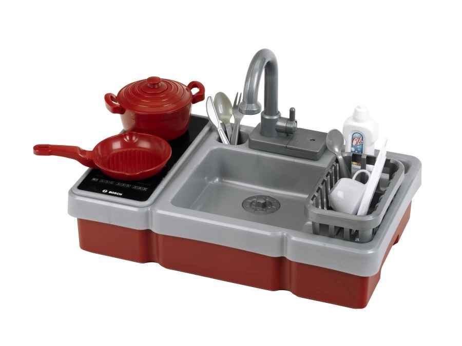 Stačí naplnit nádržku a otočit ovladačem – voda proudí jako u opravdového dřezu. Děti si bezpečně vyzkouší mytí talířů i příborů.