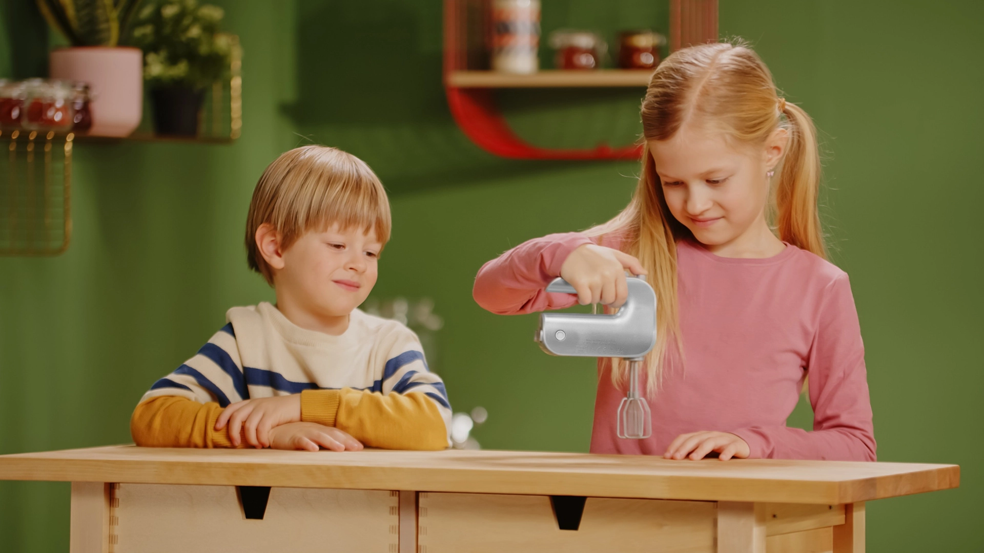 Po stisknutí tlačítka se metly roztočí a věrně napodobí práci skutečného ručního mixéru – zábava a autenticita v jednom.