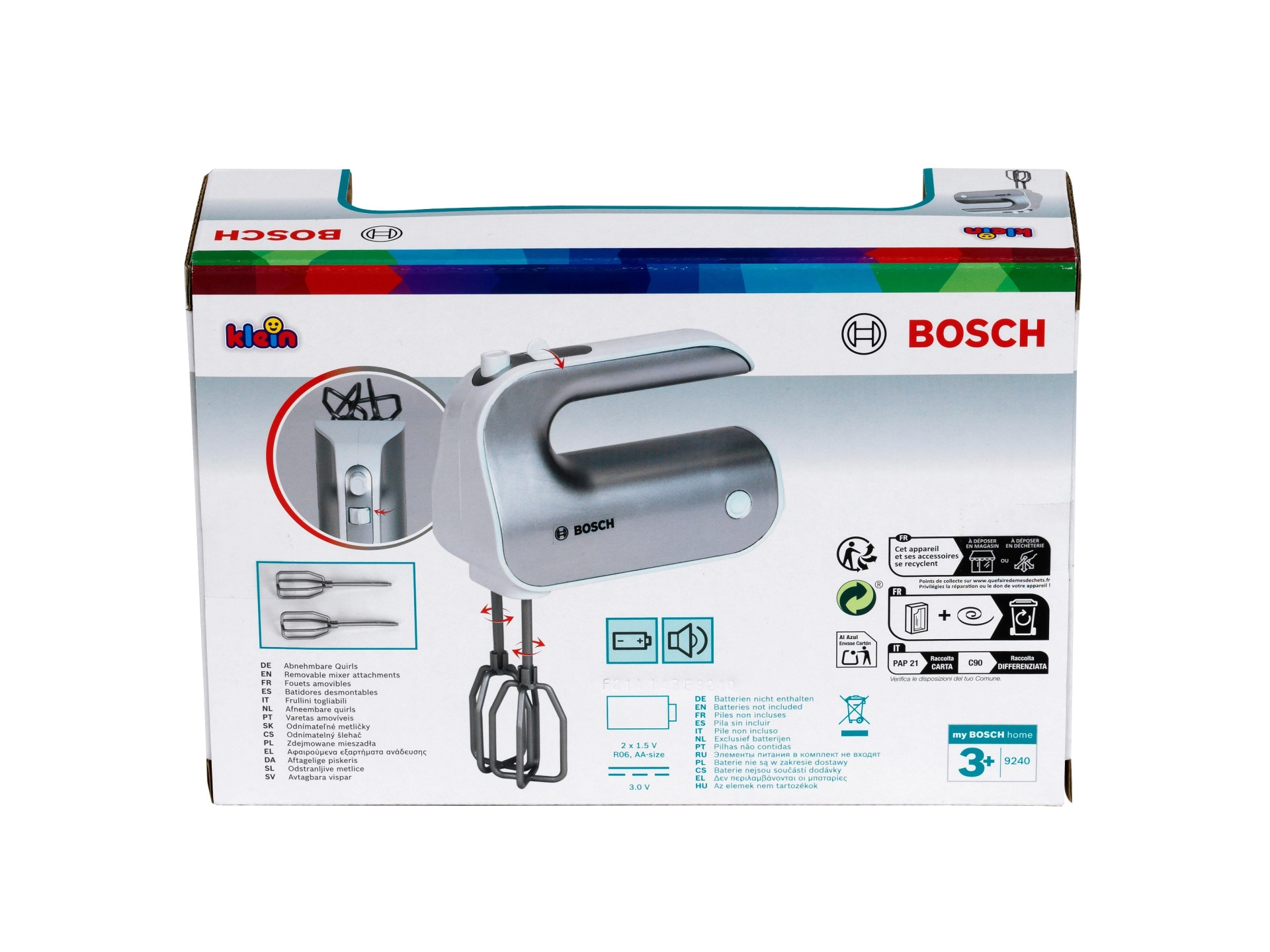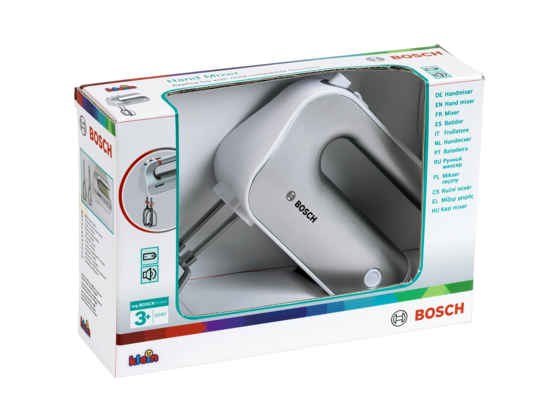 Realistický dětský ruční mixér BOSCH od značky Klein potěší malé kuchaře věrným vzhledem i funkcemi. Má otáčející se metly, přepínač rychlosti a odnímatelné nástavce pro ještě větší autenticitu hry. Lehká a bezpečná konstrukce ze z kvalitního plastu je ideální do dětských rukou.
