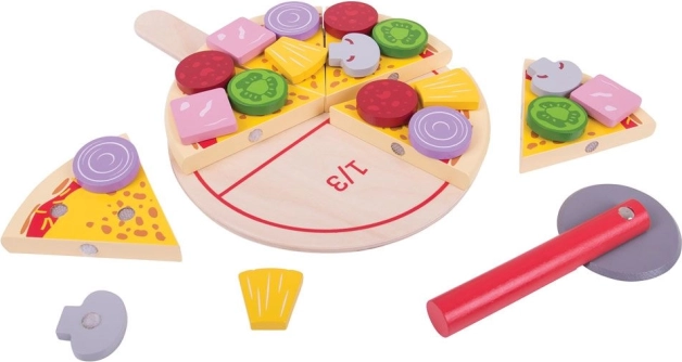 Šest plátků pizzy se spojkami na suchý zip drží pohromadě a lze je „ukrojit“ dřevěným kráječem. Děti si vyzkouší realistické krájení a servírování.