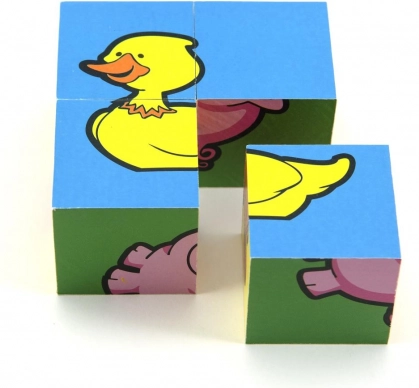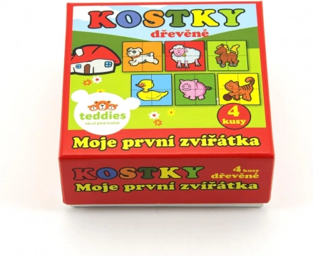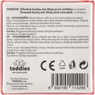 Dřevěné kostky TEDDIES Moje první zvířátka: 4 kostky, 6 obrázků. Odolná hračka pro rozvoj motoriky a fantazie. Vyrobeno v ČR.