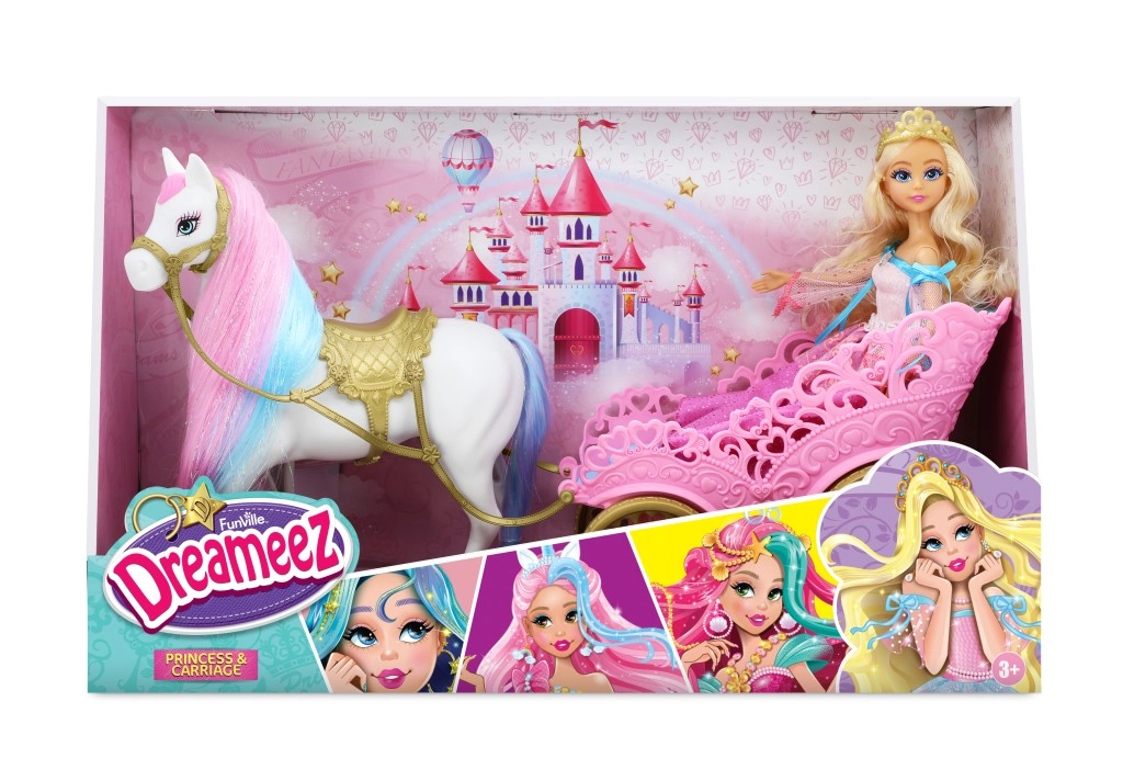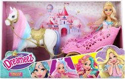Objevte pohádkový svět s dokonalou sadou DREAMEEZ – princezna, kůň a kočár tvoří kompletní herní set pro malé princezny. Panenka v nádherných růžových šatech ze saténu a jemné síťoviny se třpytivými detaily, s dlouhými vlnitými blond vlasy a zlatou čelenkou ve tvaru korunky zaujme na první pohled.