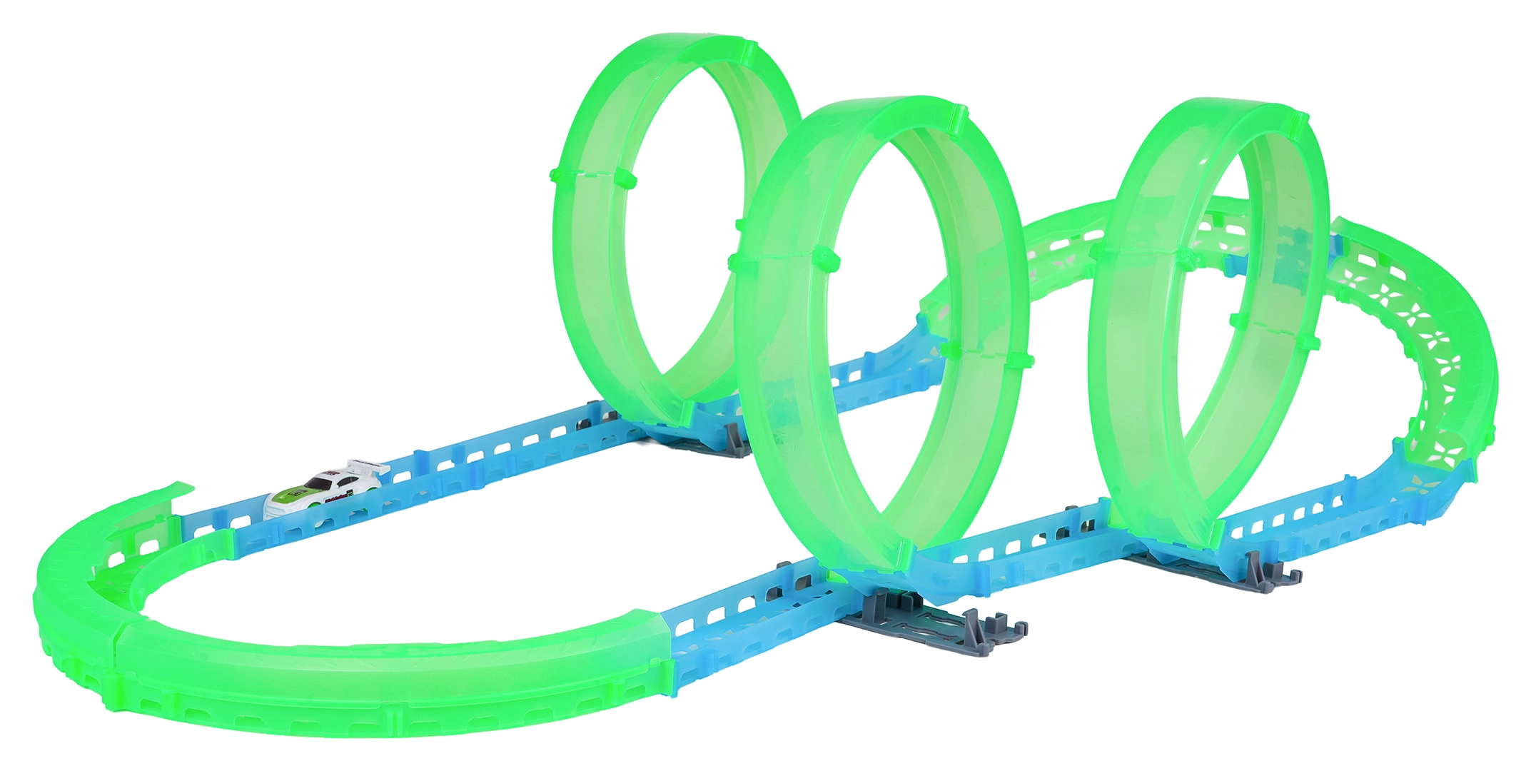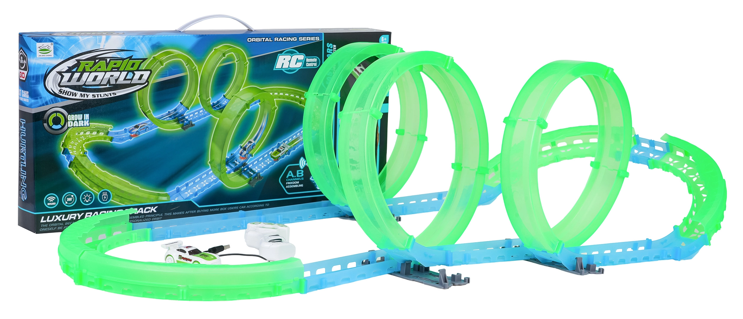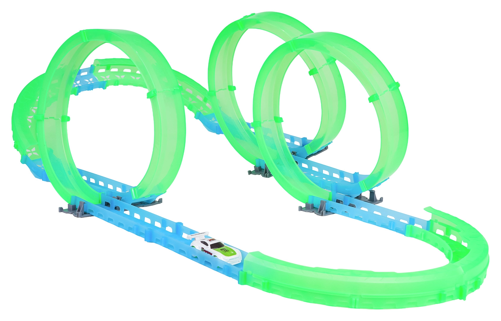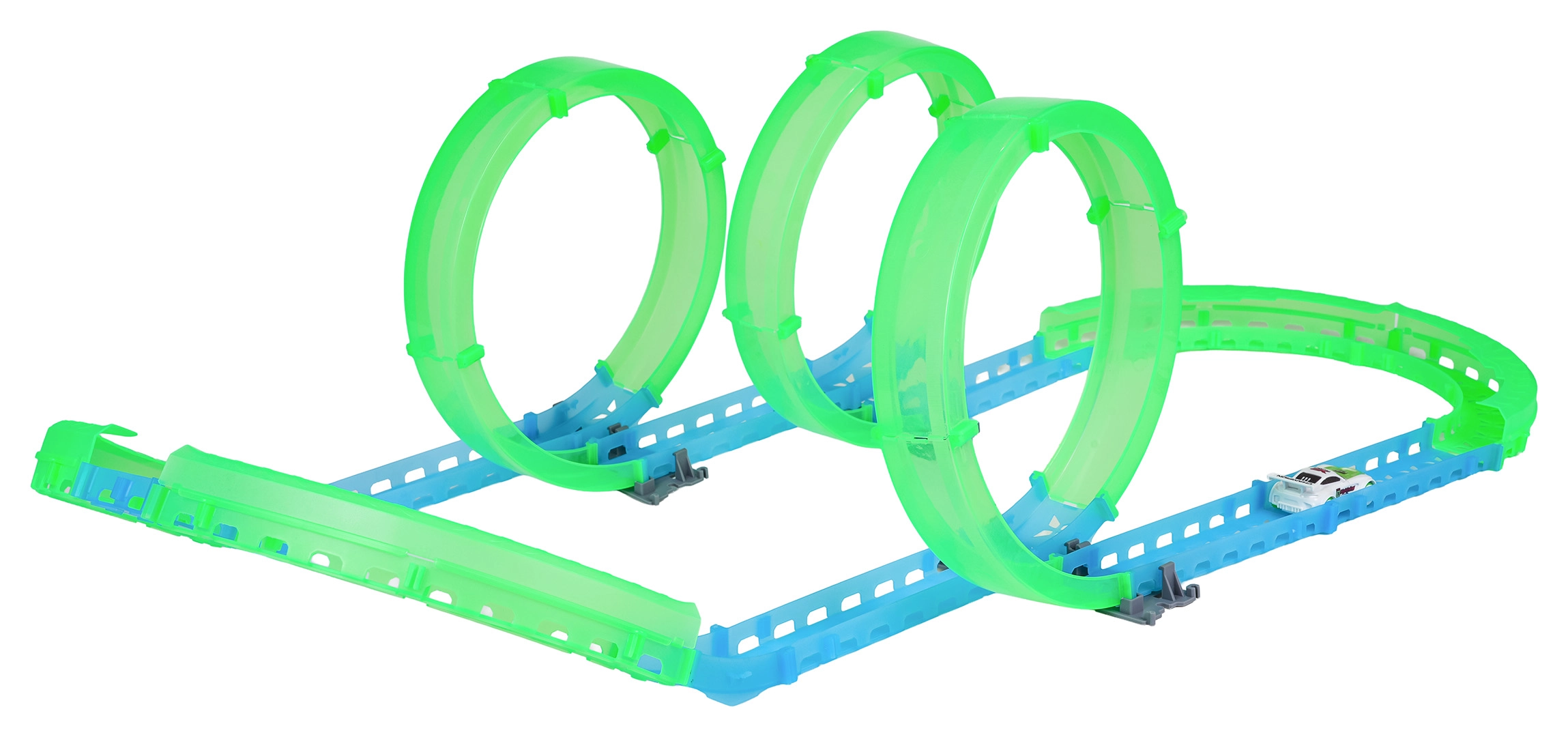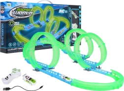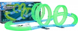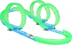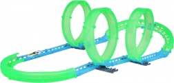 Postavte si vlastní kaskadérskou dráhu a užijte si jízdu i po setmění. Fluorescenční prvky svítí ve tmě a malé RC autíčko se řítí vpřed po připravené trati. Díky LED osvětlení vytváří během jízdy efektní světelné stopy.