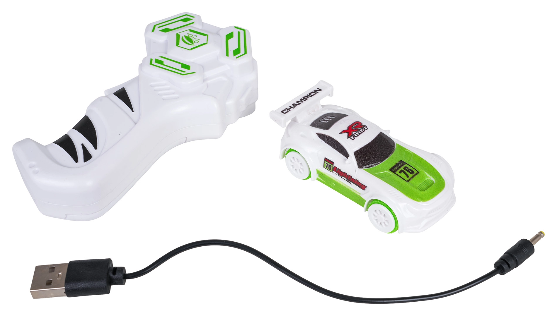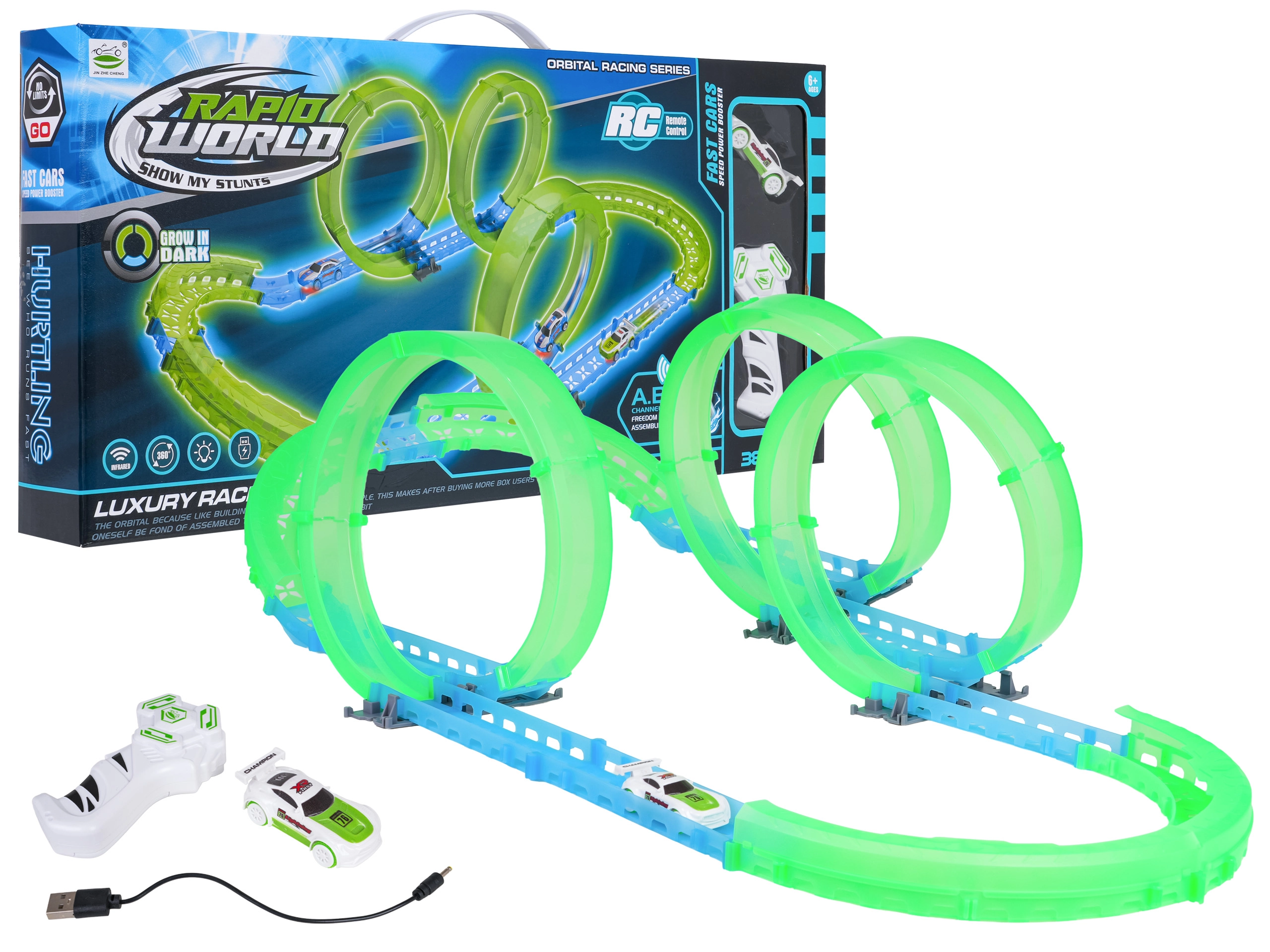 - Traťové díly, RC autíčko, dálkový ovladač, USB nabíjecí kabel, návod k montáži