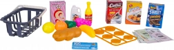 Součástí je nákupní košík, makety potravin, euro bankovky a mince i platební karta – vše pro kompletní hru na nakupování.