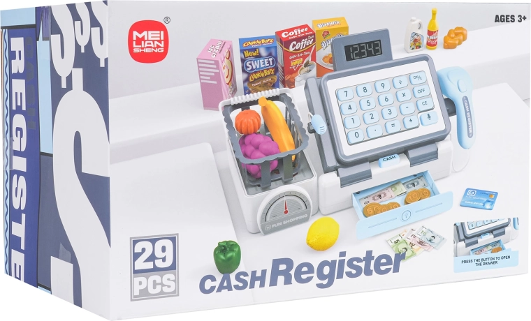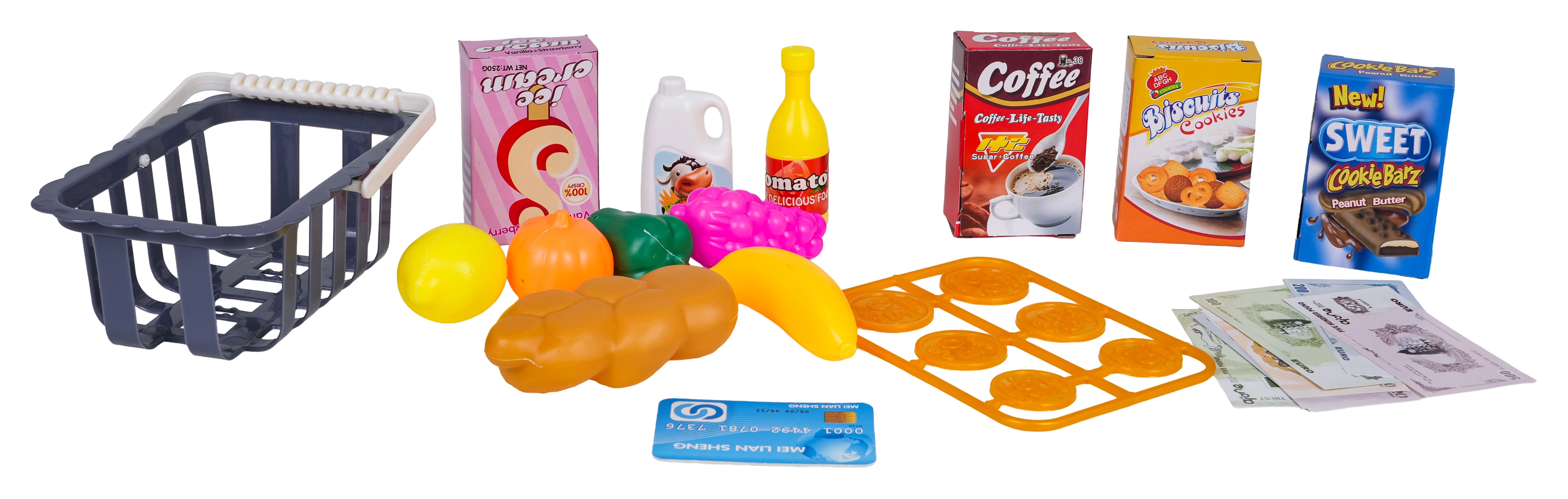 Set obsahuje až 29 dílů včetně euro bankovek a mincí, platební karty a různých maket potravin (ovoce, pečivo, nápoje i malé krabičky). Zábavná a bezpečná sada pro dlouhé hodiny hraní rolí.