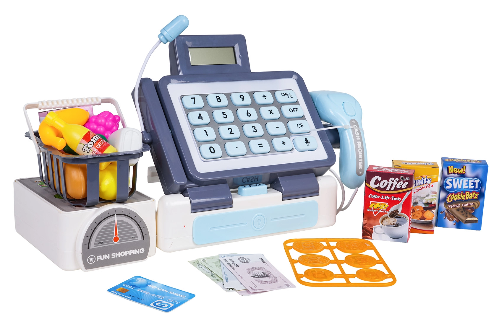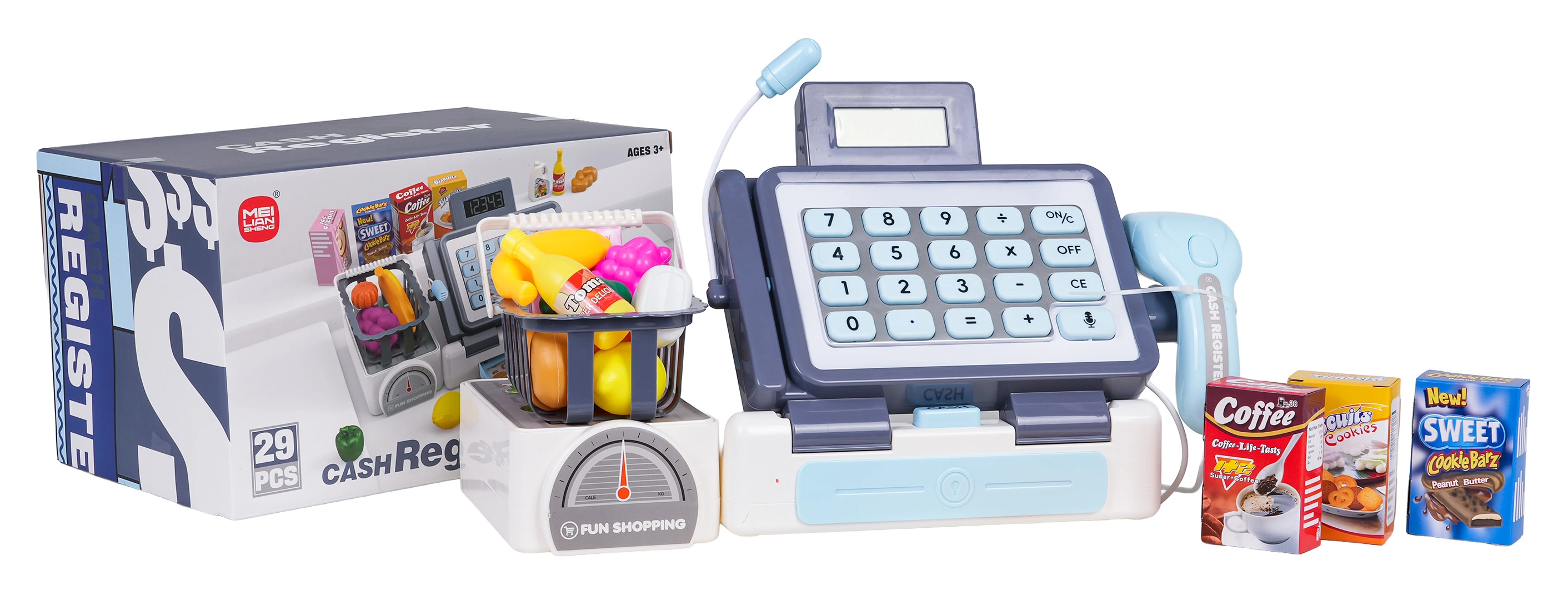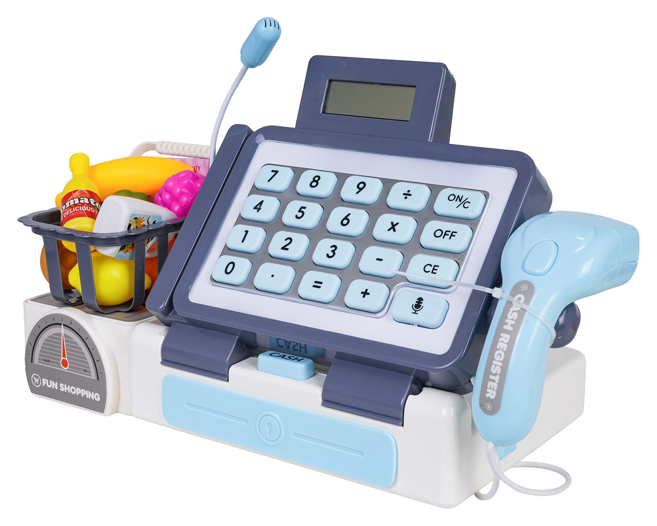 - Kalkulačka se zvuky, ruční skener se světlem a zvukem, mikrofon, váha (atrapa), otevírací šuplík na peníze