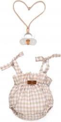Bežovo‑bílý kostkovaný romper s vázacími ramínky, pružnými nohavičkami a nařaseným pasem sedí panence bezpečně a vypadá skvěle na fotkách.