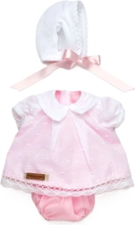 Tato elegantní sada zahrnuje růžové šatičky s bílým límečkem a krajkou, ladící bloomerky a pletenou bílou čepičku s růžovou stužkou. Pečlivé detaily, jako je jemně tečkovaná látka, krajkové lemování a pohodlné střihy, dodají vaší panence opičce Reborn autentický a půvabný vzhled.