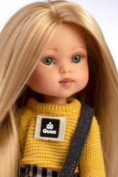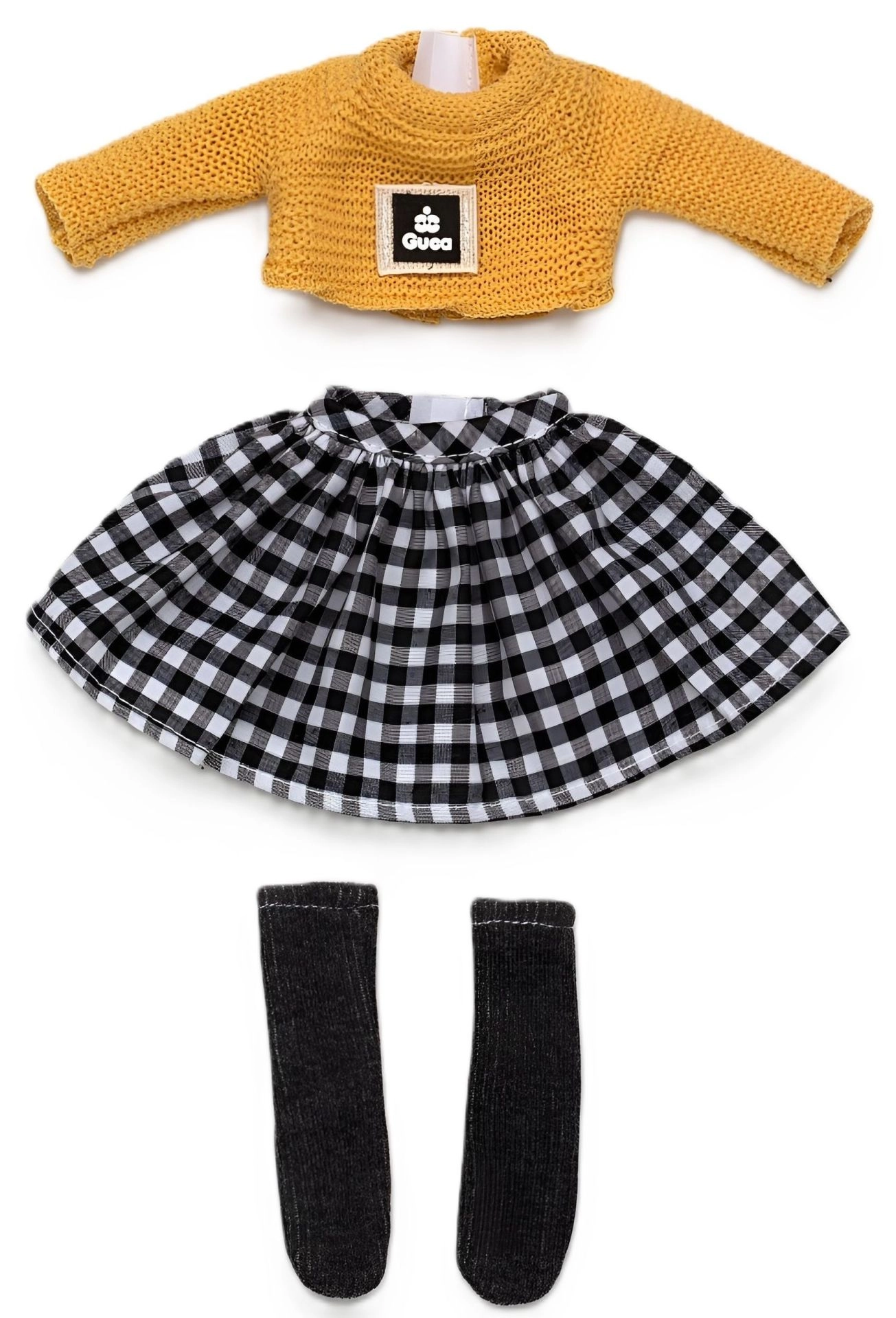 Stylový set oblečků pro panenku Penelope 34 cm přináší ruční výrobu ze Španělska, kvalitní textilie a snadné převlékání. Obsahuje pletený žlutý svetr, černobílou kostkovanou sukni a tmavé podkolenky, ideální pro kreativní hru a styling. Vhodné od 3 let.