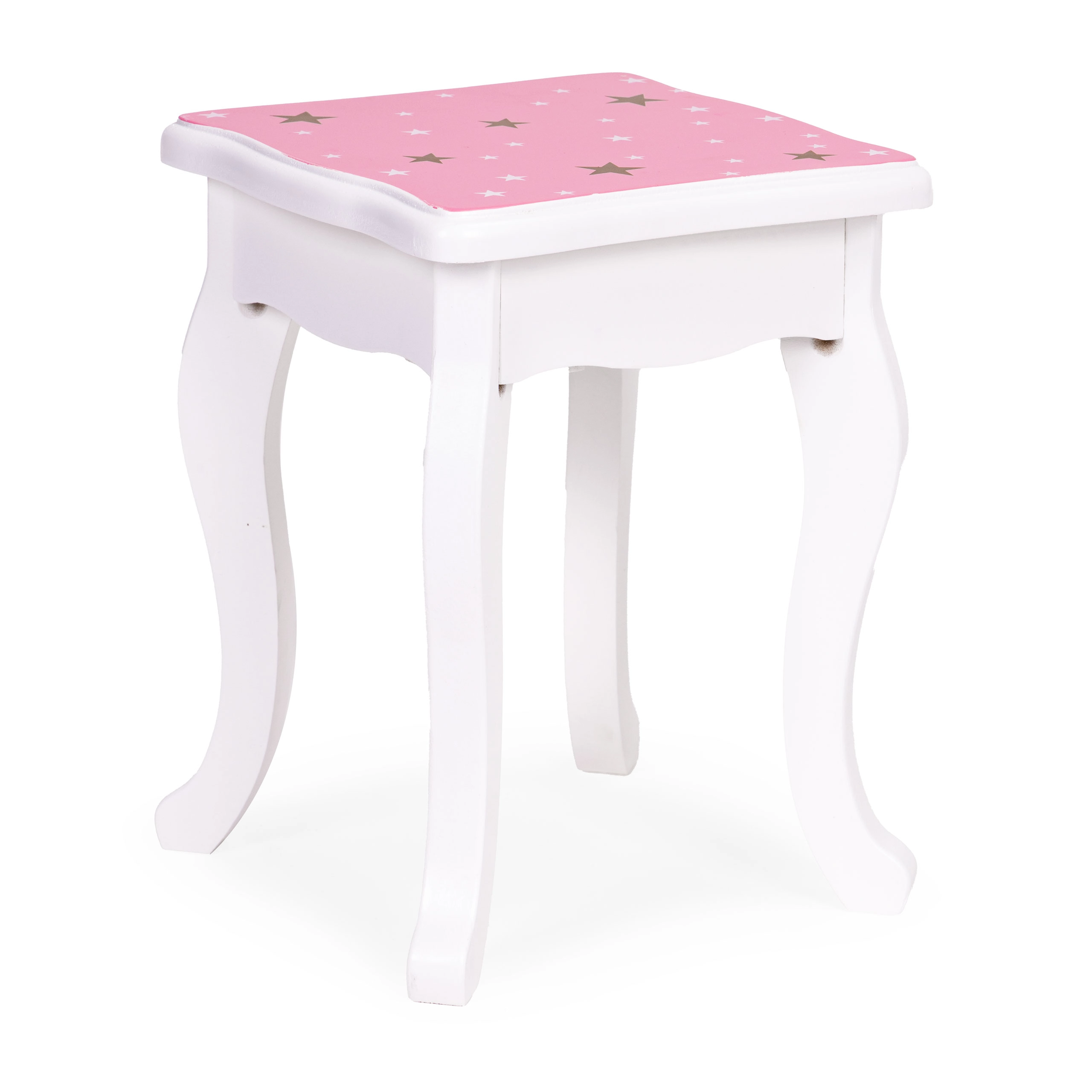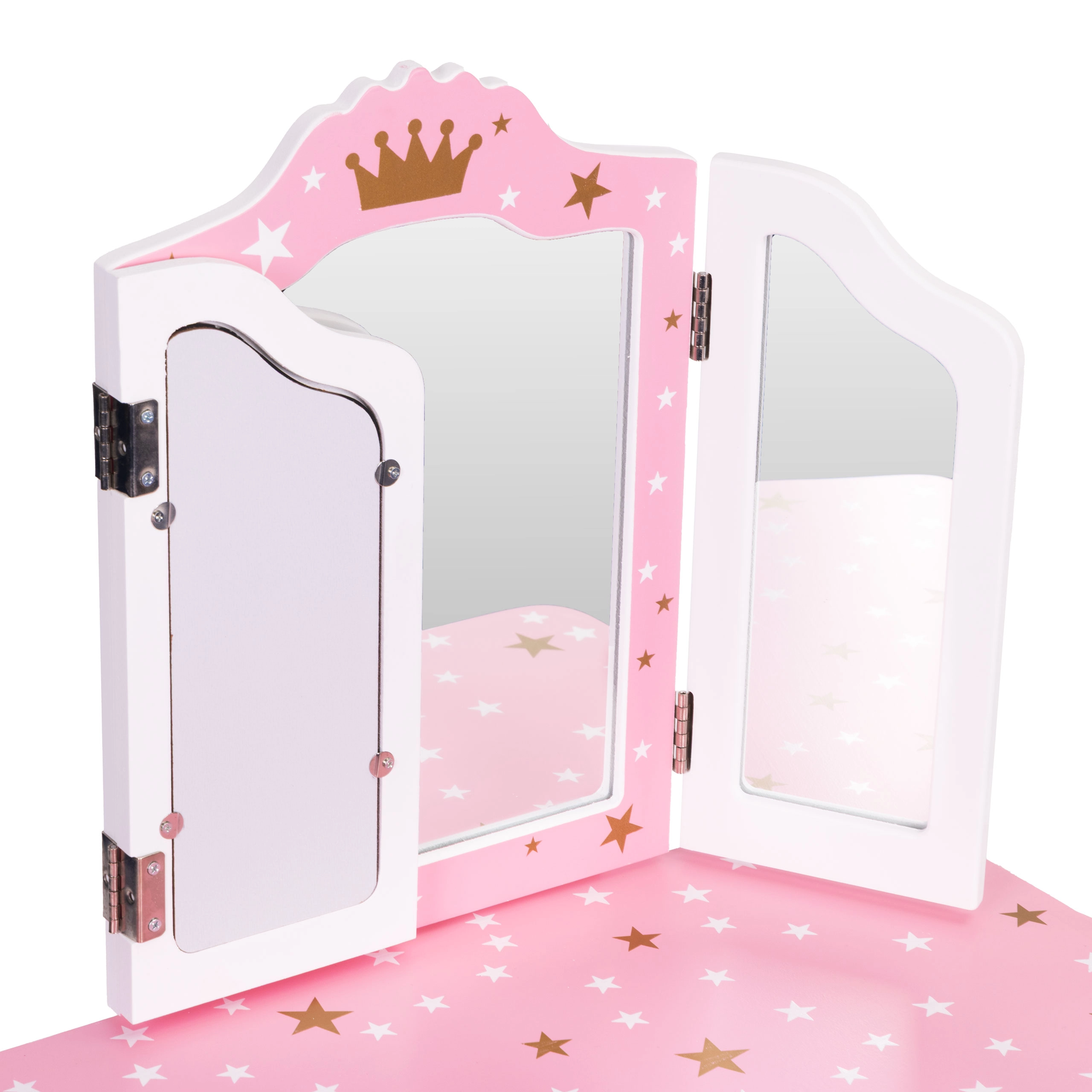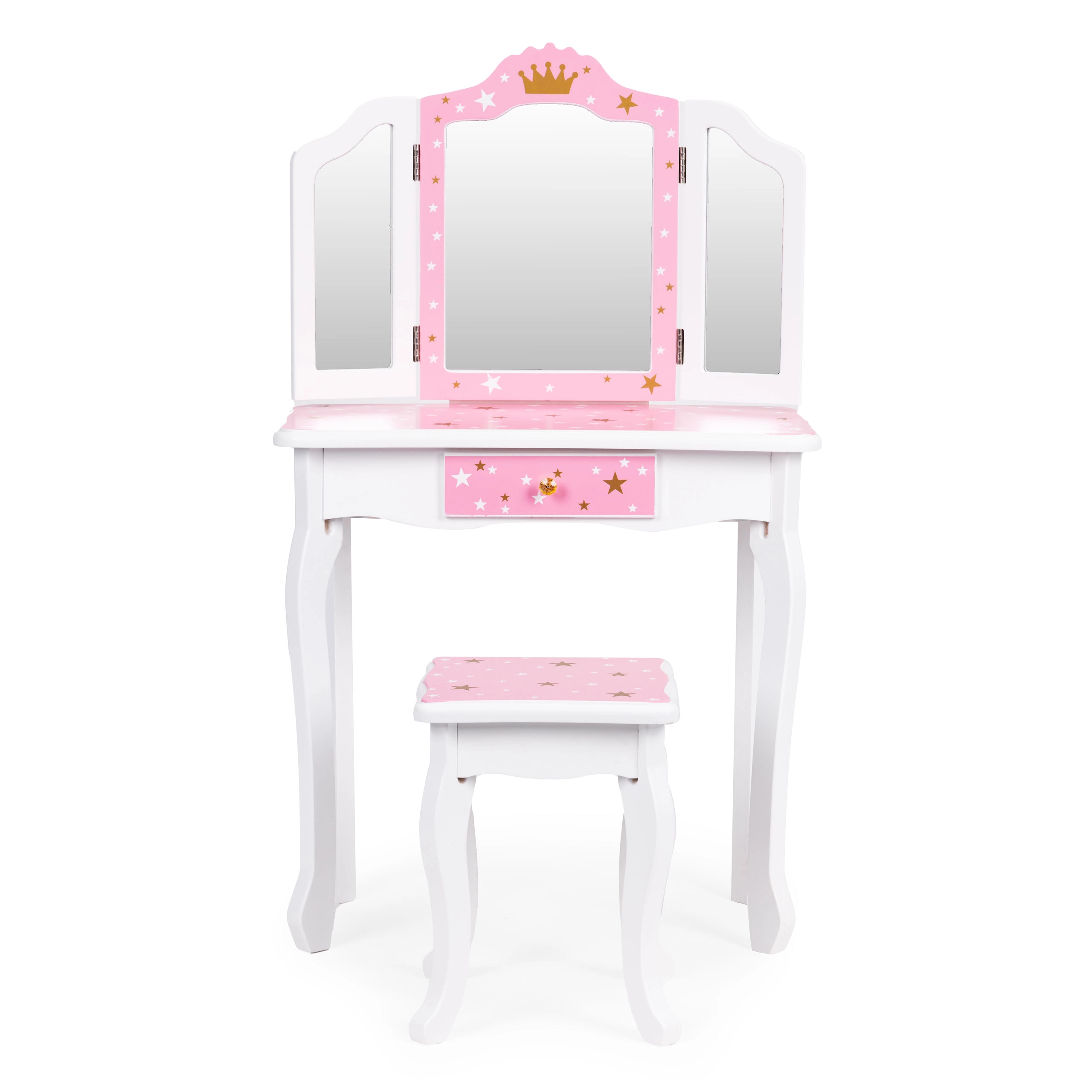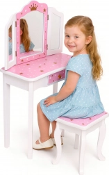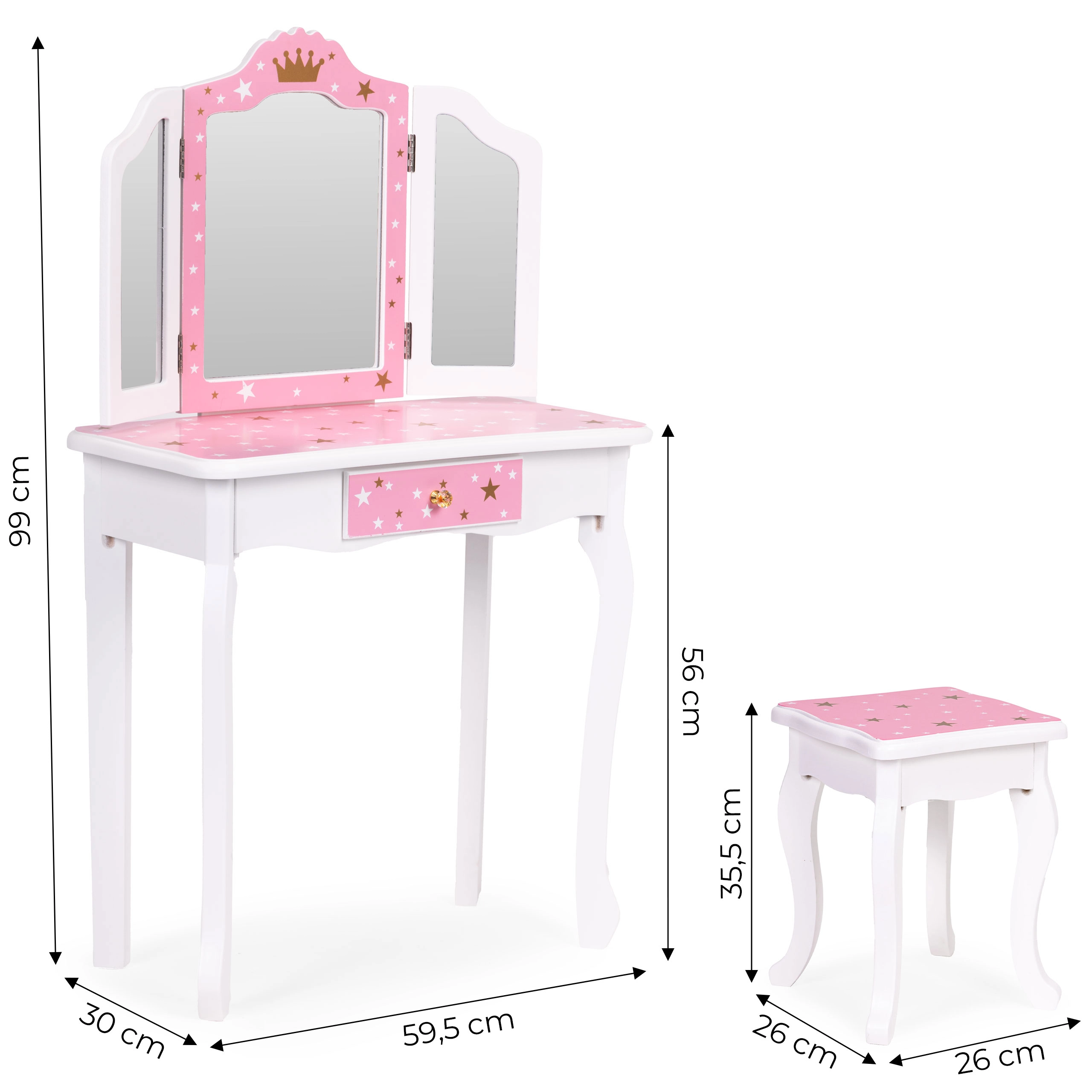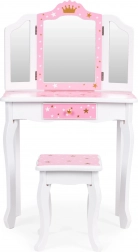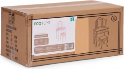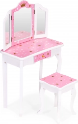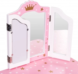 Vytvořte v dětském pokoji kouzelný koutek krásy. Toaletní stolek ECOTOYS kombinuje funkčnost a pohádkový design: velké středové zrcadlo doplňují dvě boční sklopná křídla pro pohled z různých úhlů, zatímco praktický šuplík ukryje sponky, gumičky i dětské doplňky. Set doplňuje stabilní stolička sladěná do designu.
