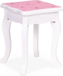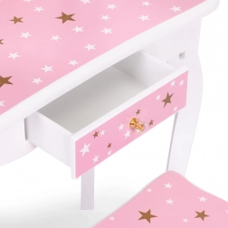 Díky kvalitnímu dřevu a MDF je stolek pevný a odolný. Podporuje jemnou motoriku, oční‑rukovní koordinaci a samostatnost při každodenní hře na „salon krásy“ nebo „princeznu“. Decentní růžová s motivy hvězdiček a korunky zapadne do většiny interiérů.