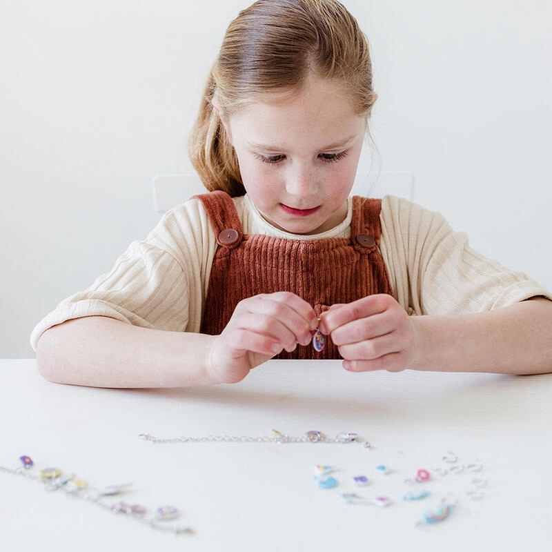 Vytvořte si vlastní kouzelné náramky s motivem jednorožce a třpytivými puffy přívěsky. Sada obsahuje vše potřebné pro jednoduché tvoření a podporuje kreativitu, jemnou motoriku a zábavu pro děti od 3 let.
