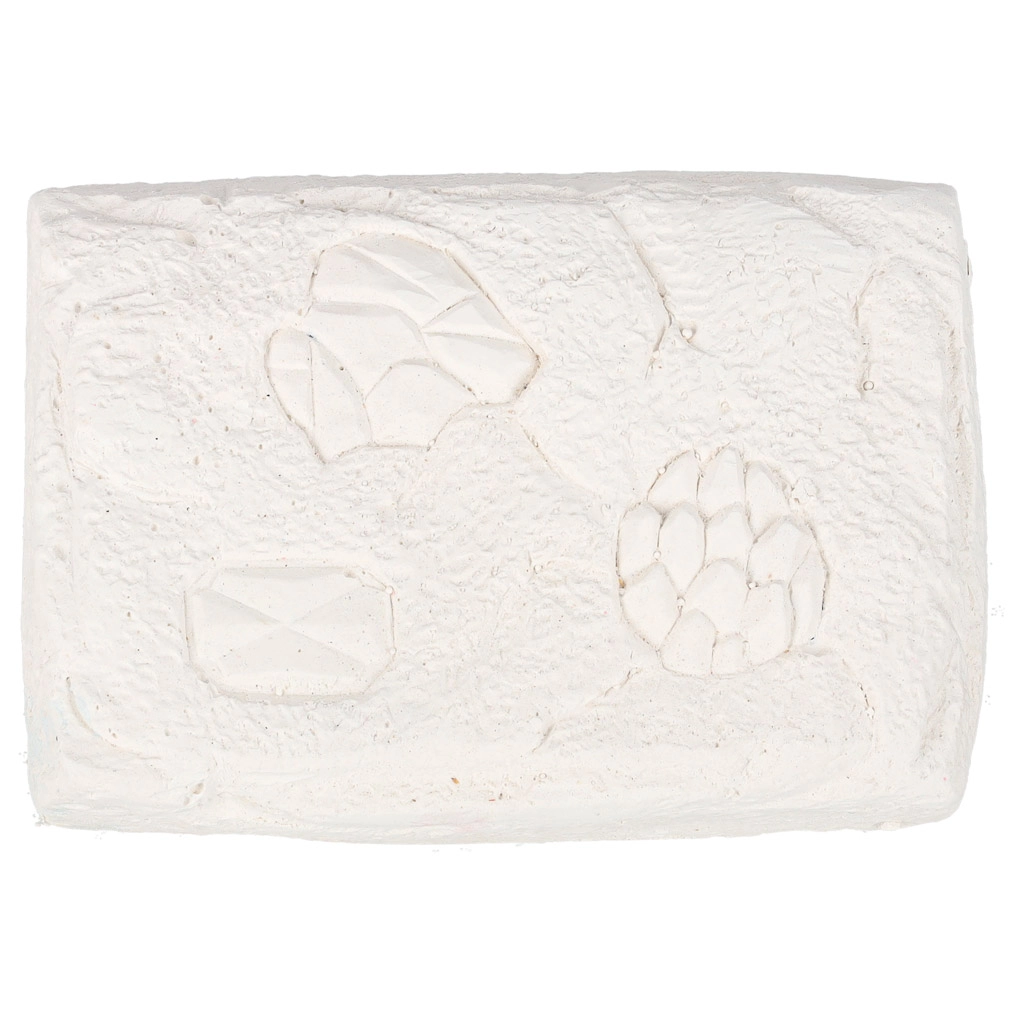 Sádrový blok ukrývá barevné kameny a mušličky. Děti je postupně odhalují dlátem, kladívkem a štětečkem – přesně jako malí archeologové.