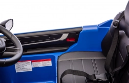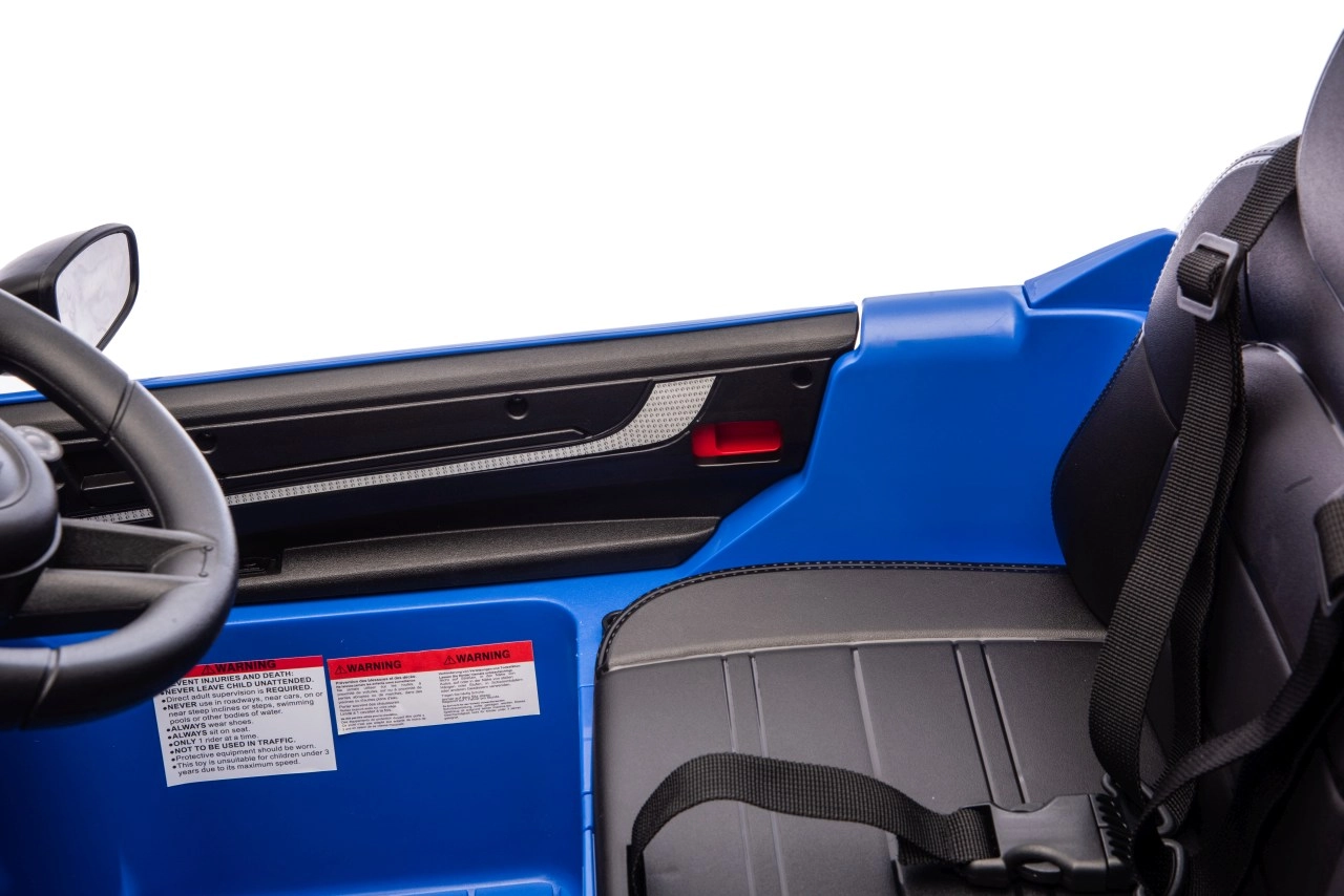 Bezpečnost dětí zajišťují bezpečnostní pásy, funkce pomalejšího startu a dálkový ovladač 2,4 GHz s nouzovým tlačítkem Stop pro rodiče. Auto má otevírací dveře, LED přední světla s vypínačem a kvalitní sedadlo z černé eko kůže. Audio panel potěší vestavěnými melodiemi, možností přehrávání MP3, Bluetooth i FM rádiem.