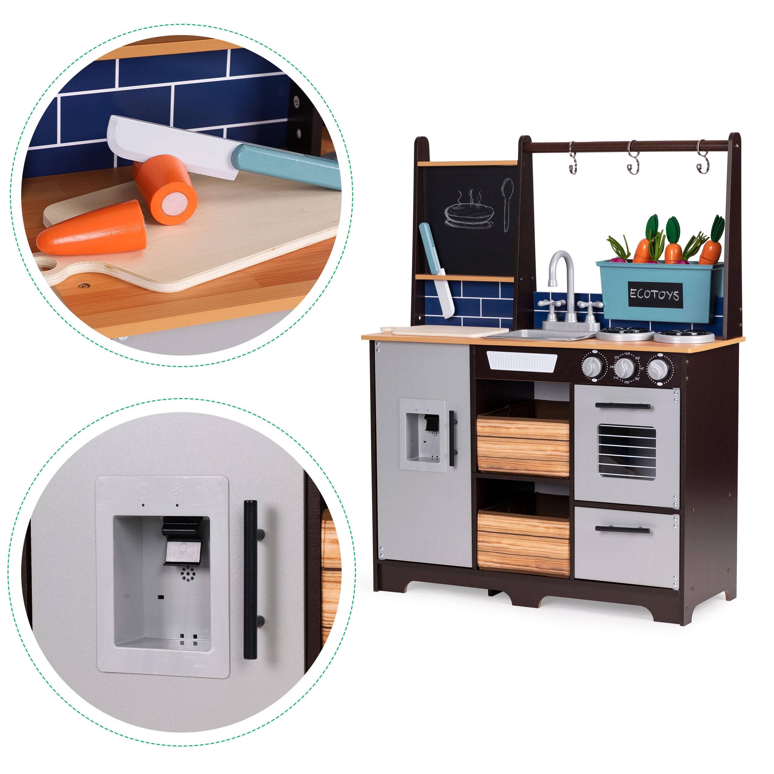 Objevte promyšlenou dětskou kuchyňku, se kterou si děti zahrají na skutečné vaření. Realistické prvky jako sporák s otočnými knoflíky, trouba, dřez s kohoutkem a dispenzor vody se zvukovým efektem vtáhnou do hry celé rodiny. Pevná dřevěná konstrukce a bezpečně zaoblené hrany zajišťují pohodové a bezpečné hraní.