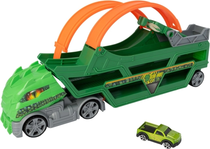 Díky chytré konstrukci set pojme až 14 autíček, takže děti mají svůj vozový park stále u sebe. Kvalitní plastové zpracování, atraktivní design s dinosaury a nápisem „Dino Hunt“ a přiložený kovový model v zeleno‑černém provedení z něj dělají perfektní hračku na doma i na cesty.