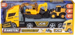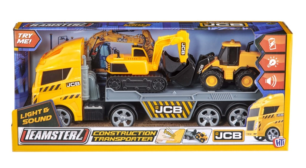 JCB transportní set přináší dětem realistický zážitek ze stavby: žlutý transportér s blikajícími světly a zvuky motoru, volně pohyblivá kola a dvojici strojů – bagr a kolový nakladač s ručně ovládanými lžícemi pro kreativní hru a rozvoj jemné motoriky.