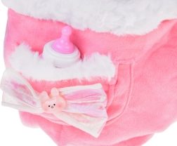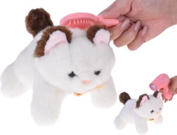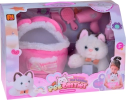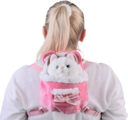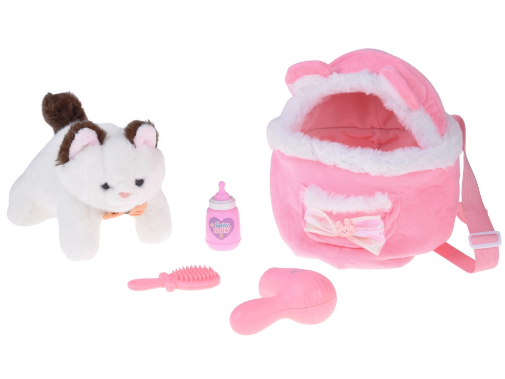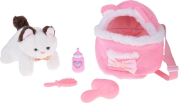 Roztomilý set pro malé pečovatele: měkoučký bílý kocourek s hnědými oušky a mašličkou, růžový plyšový batůžek a doplňky pro péči. Kocourek má ohebné tlapky pro snadné polohování, v bříšku modul s efektem tlukotu srdce pro ještě realističtější hru a v balení najdete také lahvičku, hřeben/štěteček a fén. Batůžek má nastavitelné popruhy a praktickou kapsičku na drobnosti.