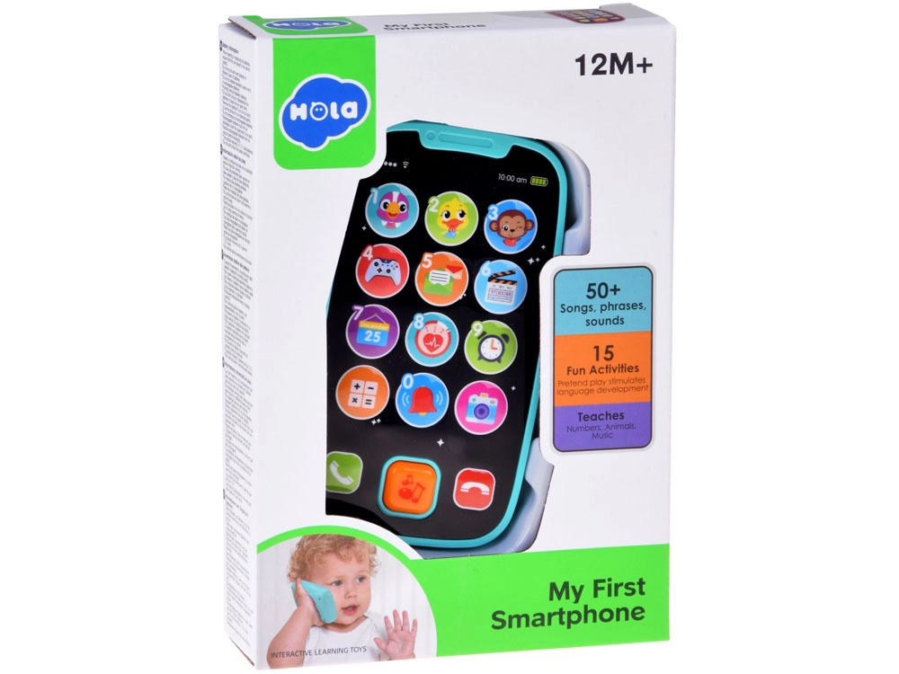 Interaktivní telefon HOLA – Můj první smartphone – je ideální hračka pro napodobivou hru a první učení. Děti si zamilují barevné ikony, blikající světélko a širokou škálu zvuků: zvířátka, hudba, fotoaparát, kalkulačka, zvonění či budík. Hračka podporuje učení čísel 0–9 v angličtině a rozvíjí koordinaci oko–ruka i zvědavost.