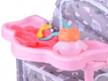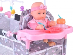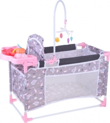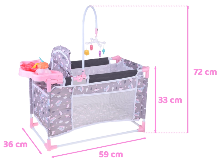Roztomilý set pro panenky 2v1 kombinuje postýlku s karuselou a jídelní židličku v jednom. Součástí je bohaté příslušenství (láhev, talířek, lžička, vidlička, nožík), takže děti mohou svou panenku krmit, pečovat a ukládat ke spánku. Stabilní kovová konstrukce, jemná růžovo‑šedá barevnost a doplňky pro realistickou hru podporují empatii, jemnou motoriku a sociální dovednosti.
