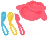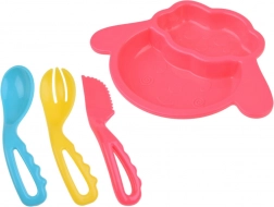 Součástí je židlička a praktická sada nádobí: talířek, lžička, vidlička a nožík – vše uzpůsobené dětským ručkám.