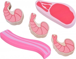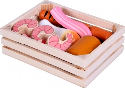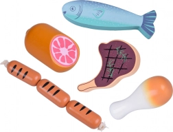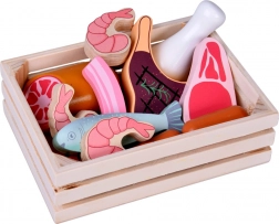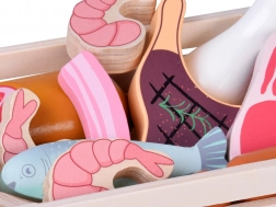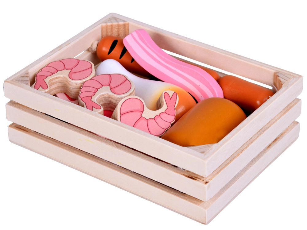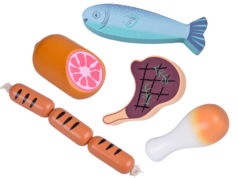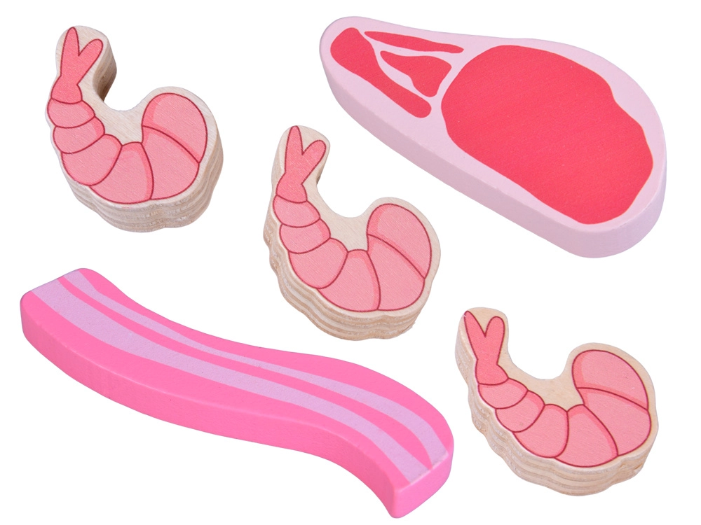 Tato dřevěná sada potravin obsahuje vše, co děti znají z kuchyně nebo obchodu: párečky, salám, slaninu, steaky, kuřecí kousky, rybu i krevety. Díly jsou pevné, příjemně zaoblené a detailně malované, aby působily realisticky a přitom zůstaly zcela bezpečné pro hru.