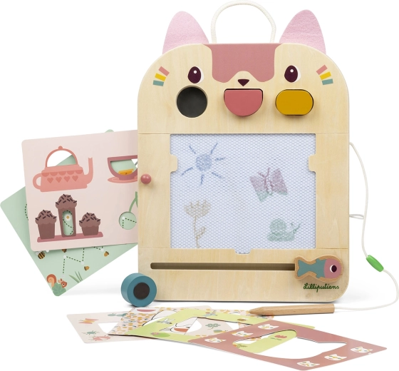 Objevte kouzelnou kreslicí tabulku kočička Jeanne od Lilliputiens, která dětem od 18 měsíců nabízí nekonečné možnosti kreslení a her. Součástí jsou 3 razítka s tvary, 6 oboustranných karet s aktivitami a dřevěná tužka na provázku. Obrázky lze snadno rychle vymazat a začít znovu – ideální pro rozvoj jemné motoriky a smyslového vnímání.