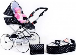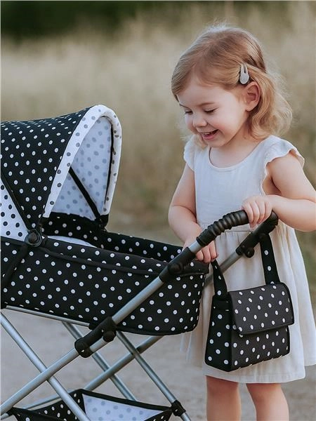 Elegantní dětský retro kočárek pro panenky NEW BABY Natálka v bílo‑černém puntíkovém designu potěší všechny malé pečovatelky. Stabilní kovová konstrukce s odpružením a lehké gumové kola zajišťují plynulou a pohodlnou jízdu doma i venku. Nastavitelná rukojeť v 5 polohách roste spolu s dítětem a skládací stříška chrání panenku před sluncem.