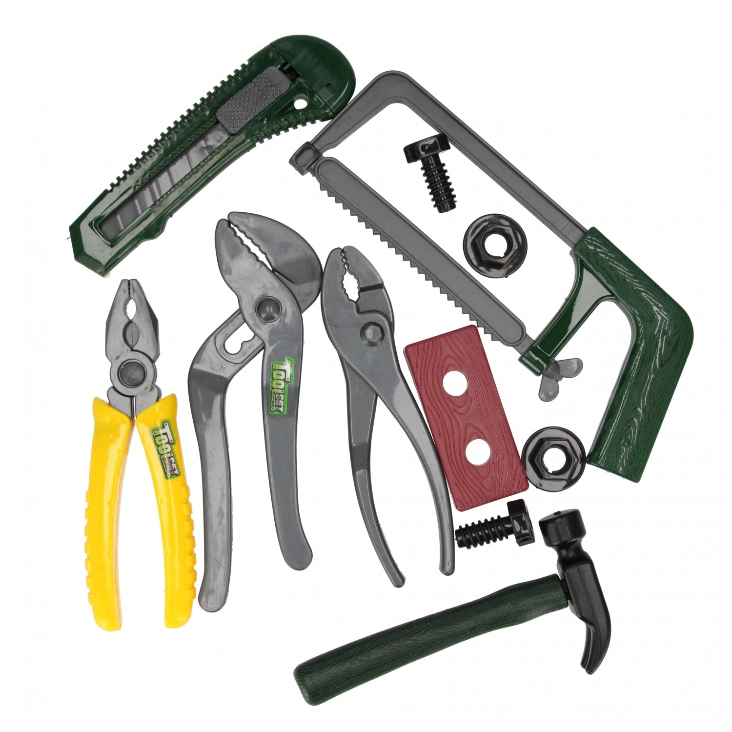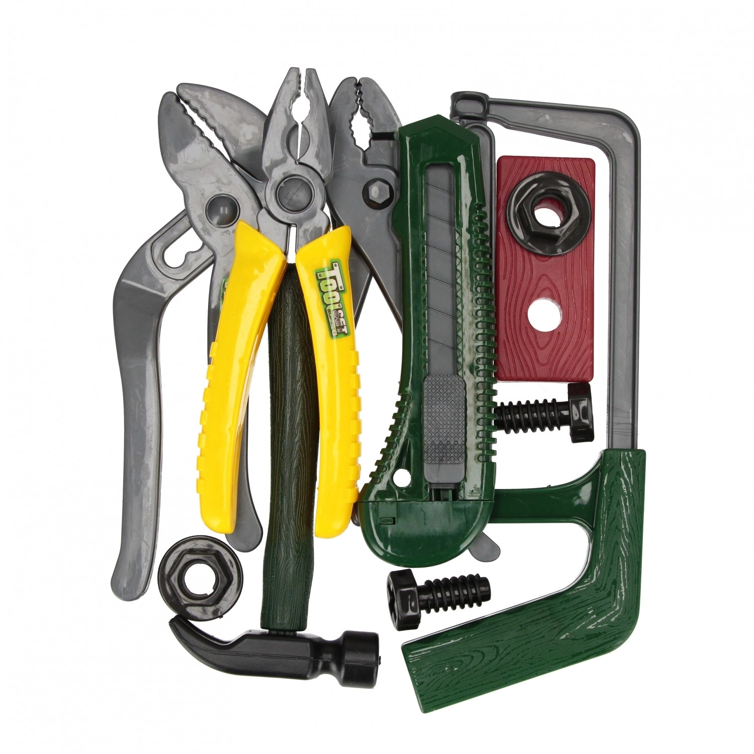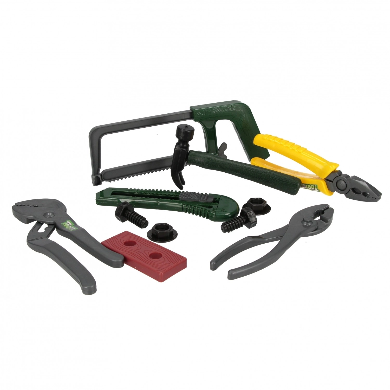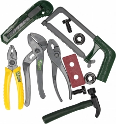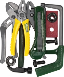 Tato barevná sada obsahuje výběr základních nástrojů pro dětské kutilství – od kleští a pilky až po šrouby a matice. Vše je vyrobeno z lehkého a odolného plastu, který je příjemný do ruky a umožňuje bezpečné hraní bez ostrých hran.