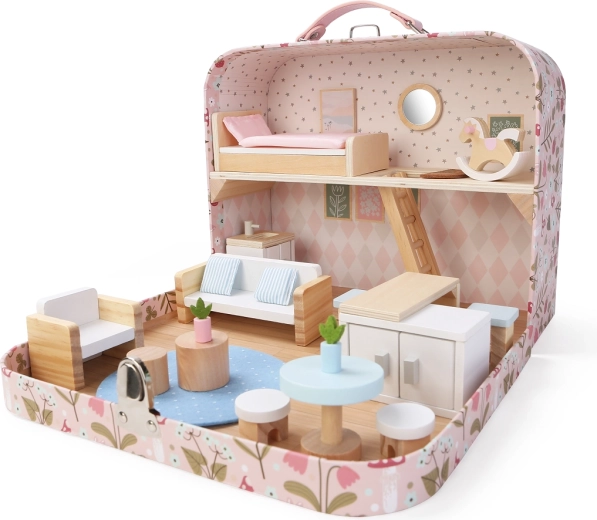 Objevte kouzelný svět na cesty: přenosný domeček pro panenky ukrytý v elegantním kufříku. Po otevření se promění v útulné obydlí s miniaturním nábytkem a dekoracemi. Ideální pro hraní doma i na cestách, podporuje dětskou kreativitu a fantazii. Obsahuje houpacího koníka, postýlku, pohovku, křeslo, žebřík do patra a další doplňky. Přenosný kufřík, bohaté příslušenství, snadné přenášení a zábava pro děti od 3 let.