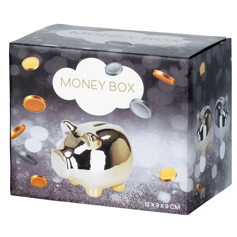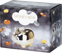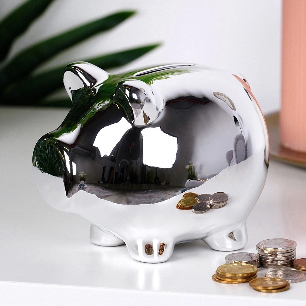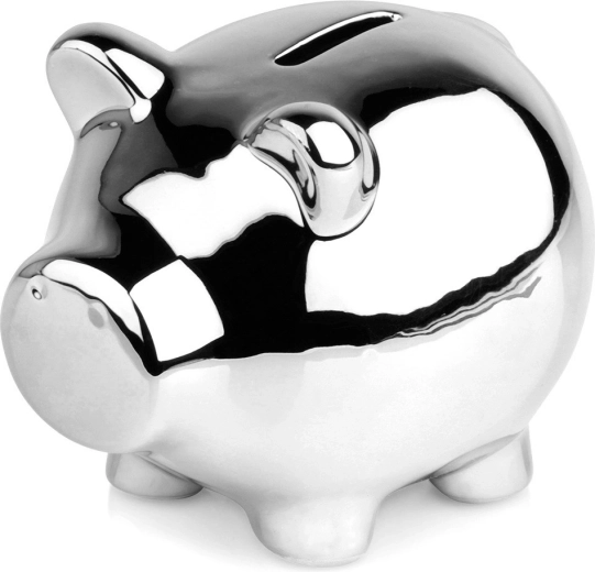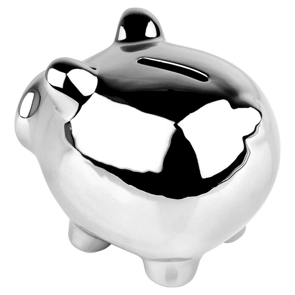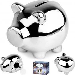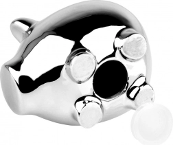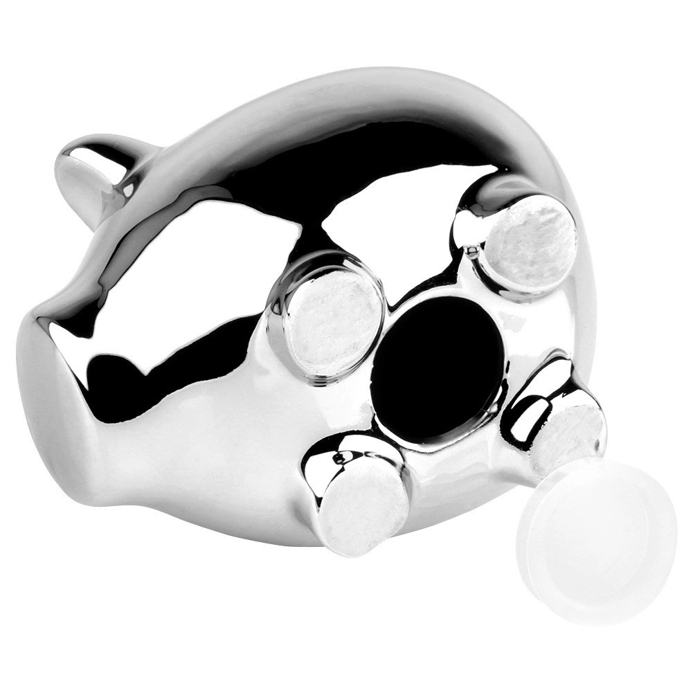 Elegantní pokladnička ve tvaru prasátka s lustřným stříbrným povrchem z keramiky. Praktický spodní otevíratelný uzávěr umožní vybírat úspory bez rozbíjení. Kompaktní rozměry 11,5 × 9 × 9 cm a moderní vzhled dělají z pokladničky stylový dekorativní doplněk i skvělý dárek pro děti i dospělé.
