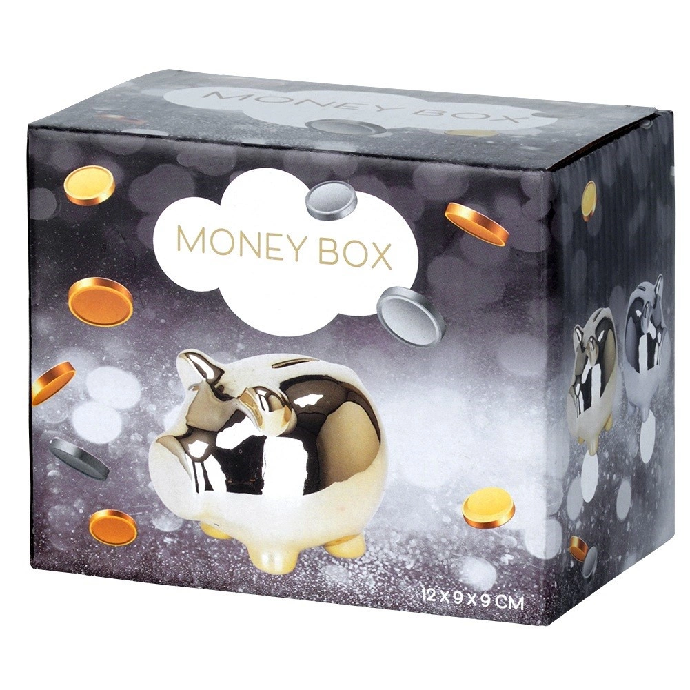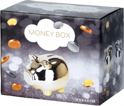 Stylová pokladnička ve tvaru prasátka se zrcadlovým zlatým povrchem je ideální pro spoření mincí i bankovek. Kompaktní rozměry 11,5 × 9 × 9 cm, otevíratelný uzávěr ve spodní části a dekorativní glamour vzhled z ní dělají skvělý doplněk domova i vkusný dárek pro děti i dospělé.