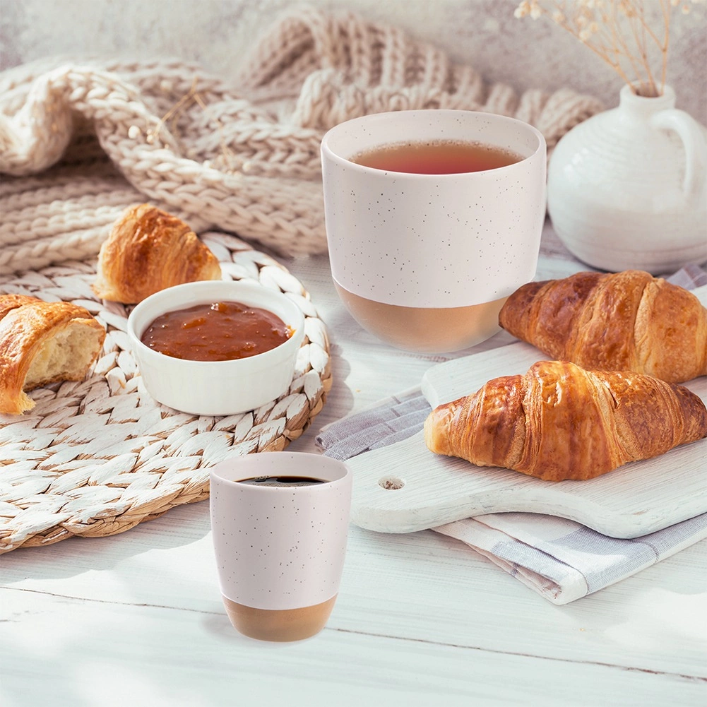 Tečkovaná bílá glazura a přírodní kameninový spodek zaručují moderní vzhled, který vynikne na každém stole.
