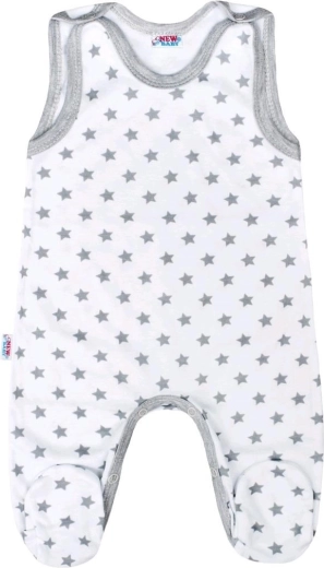 Pohodlné kojenecké dupačky New Baby Classic II v šedé barvě s jemným motivem hvězdiček. Díky zapínání na cvočky na ramínku a mezi nožičkami je oblékání i přebalování rychlé a snadné. Vyrobené ze 100% měkké bavlny pro maximální komfort citlivé dětské pokožky.