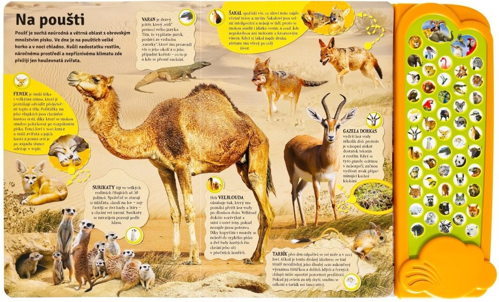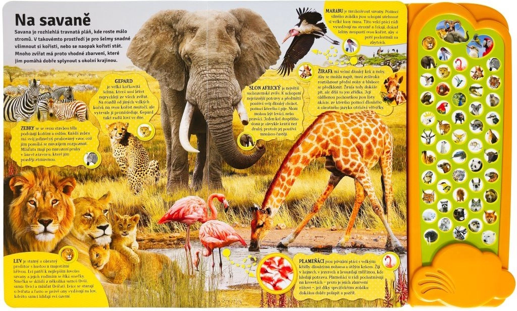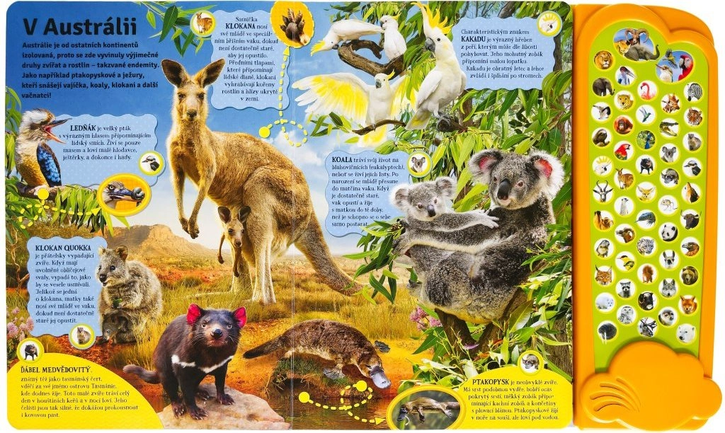 Objevte svět zvířat s interaktivní knihou, která dětem přiblíží přírodu prostřednictvím 50 skutečných zvuků zvířat a reálných fotografií. Malí čtenáři prozkoumají savanu, džungli, Austrálii, poušť i oblast kolem severního pólu a naučí se rozpoznávat druhy podle zvuku i vzhledu. Ideální zábavně-naučná kniha pro zvídavé děti.