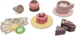 Sada je vyrobena z odolného dřeva v jemných pastelových barvách a nabízí bohaté příslušenství: šálky s podšálky, lžičky, příbory, dortíky, zmrzliny a další doplňky, které podporují role-play, rozvoj jemné motoriky, sociálních dovedností a jazykového projevu.