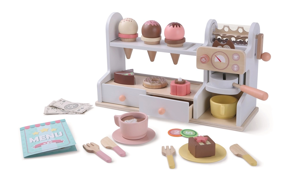 Tato stylová dřevěná cukrárna a kavárna 2 v 1 promění dětský pokoj v malé bistro. Kompaktní pult s kávovarem, vitrínou na dezerty a poličkou s otvory na zmrzlinové kopečky zve k nekonečné porci zábavy. Součástí je i platební zásuvka s falešnými penězi, takže děti mohou trénovat obsluhu i placení.