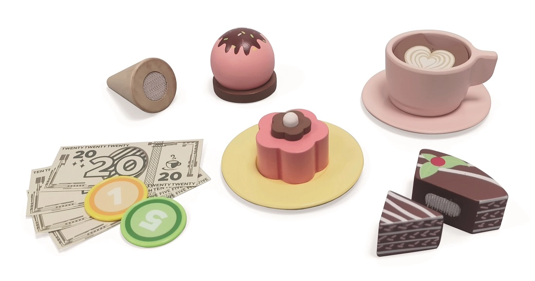 Šálky s podšálky, dezerty, zmrzlinové kopečky, příbory, mince a bankovky – celkem 46 dílů pro spoustu scénářů.