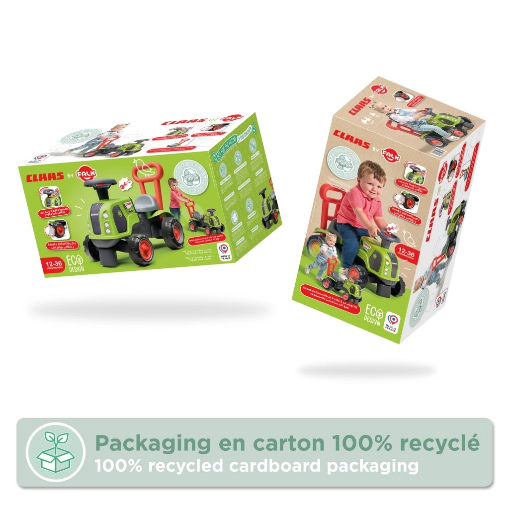 Dětské odstrkovadlo traktor CLAAS je skvělou volbou pro malé řidiče od 12 měsíců. Nabízí tichá kola pro hraní doma i venku, směrový volant pro snadné ovládání, klakson pro větší zábavu a široká stabilní kola pro bezpečnou jízdu. Vyrobeno ve Francii z kvalitních recyklovaných plastů, s nosností 25 kg.