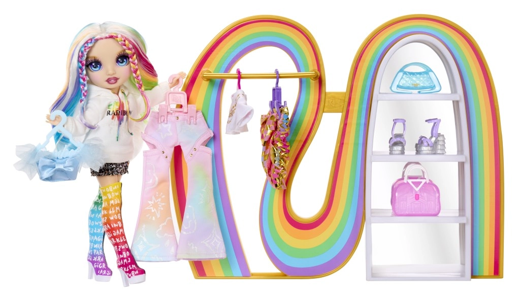 - 1 panenka, duhový šatník/stojan, 6 módních kousků, 2 páry bot, 2 kabelky, hřeben, šatní stojan se 4 ramínky, 4 patrové regály na boty