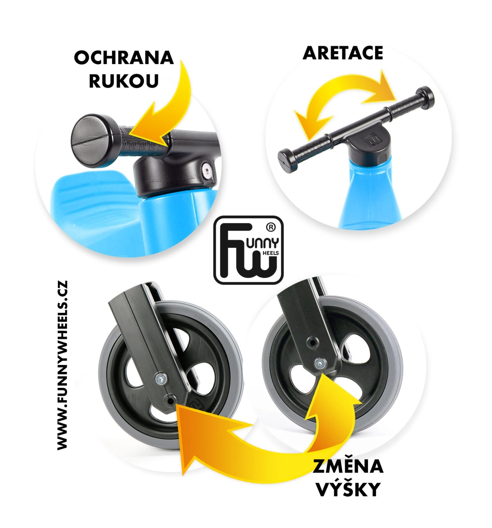 Omezené otáčení vidlice brání přetočení řídítek, rozšířené koncovky chrání ruce a odolný nezávadný plast má hladké spoje.