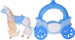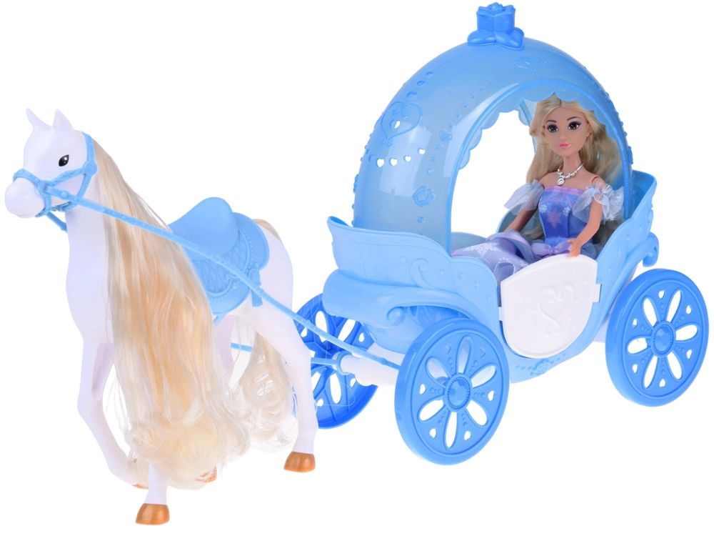- Panenka princezna, tiara, náhrdelník, boty; bílý kůň se sedlem a uzdou; kočár