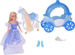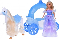 - Obsah balení: panenka princezna v balových šatech a botách, tiara a náhrdelník, bílý kůň se sedlem a uzdou, kočár