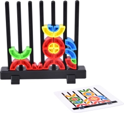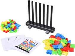 Součástí jsou karty se vzory, podle kterých děti skládají barevné dílky na tyčky – nebo mohou tvořit vlastní nápady a rozvíjet kreativitu.