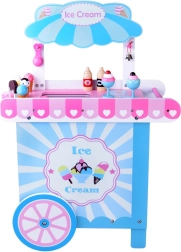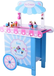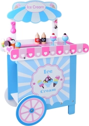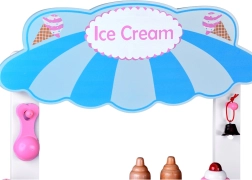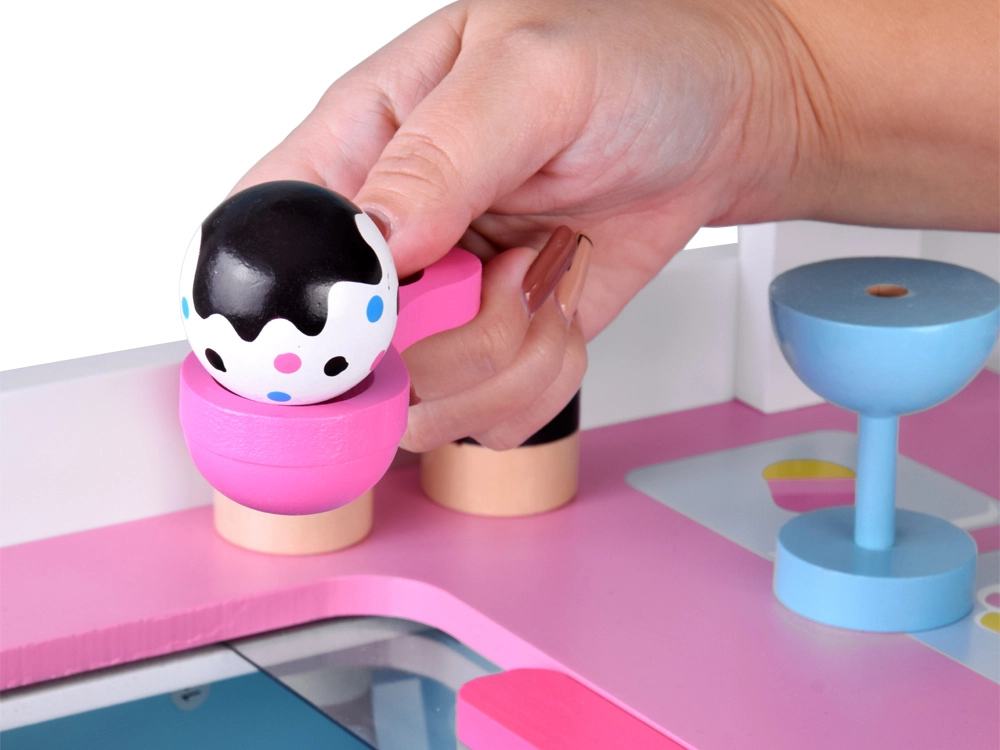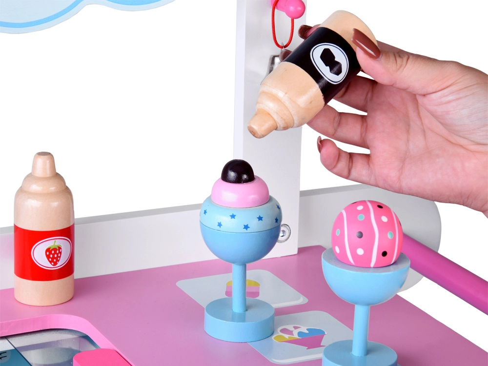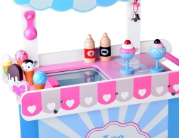 Tento stylový dětský zmrzlinový vozík v jemných růžových a modrých odstínech je ideální pro hraní na obchod i cukrárnu. Horní pult slouží jako prodejní deska pro vystavení kopečků, kornoutů a nanuků, pod ní najdete velkou polici a posuvnou „chladničku“ na ukládání dobrot a doplňků. Praktické dva háčky a stříbrný zvoneček dotvářejí autentický zážitek ze servírování.
