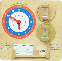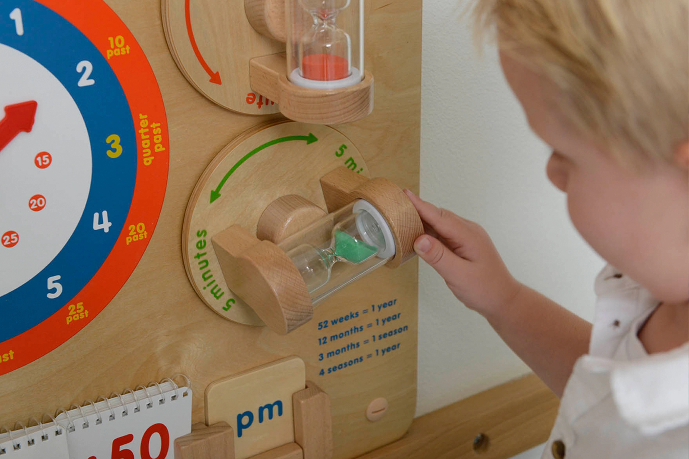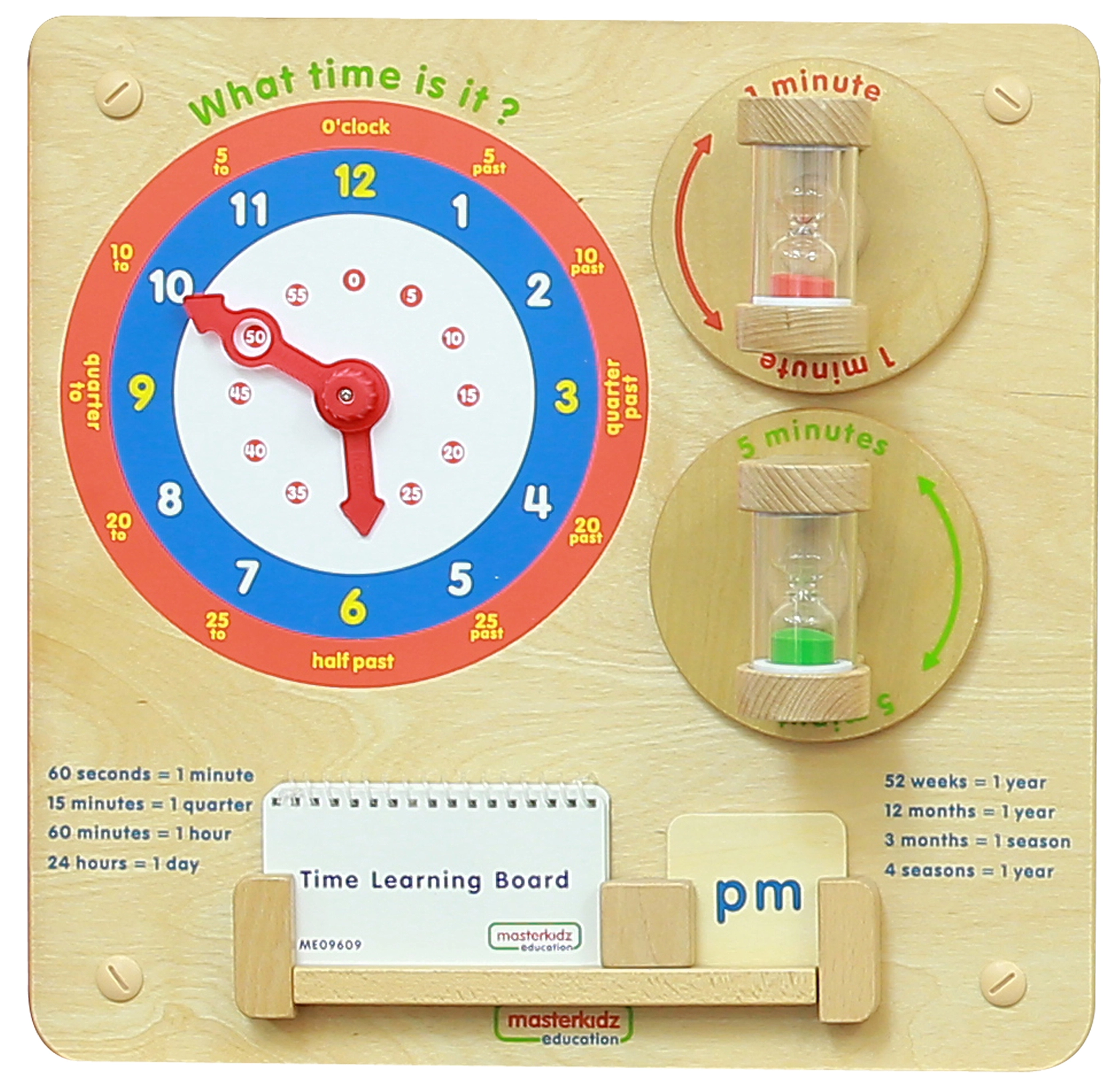Dřevěná vzdělávací tabule MASTERKIDZ učí děti číst čas z klasických hodin, pochopit minuty, hodiny a dny a vnímat trvání času pomocí dvou klepsydr (1 a 5 minut). Odolná konstrukce na stěnu nebo do systému Masterkidz Flex, pohyblivé ručičky a přehledné popisky podporují logické myšlení, jemnou motoriku a samostatnou hru.