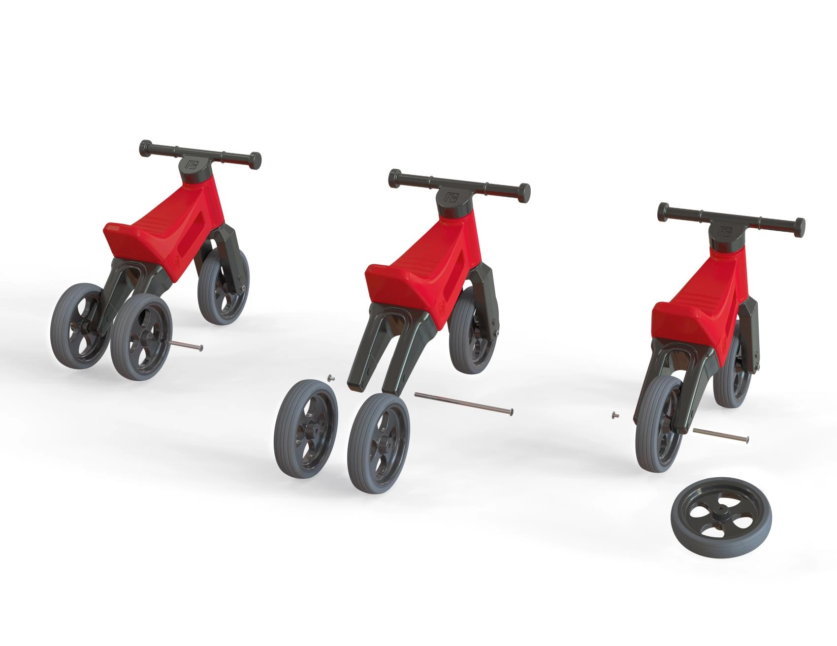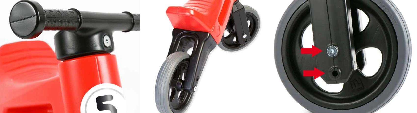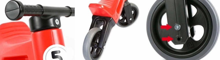 odrážedlo sestavené jako tříkolové, 2 imbusy, kratší osa pro přestavbu na dvoukolové